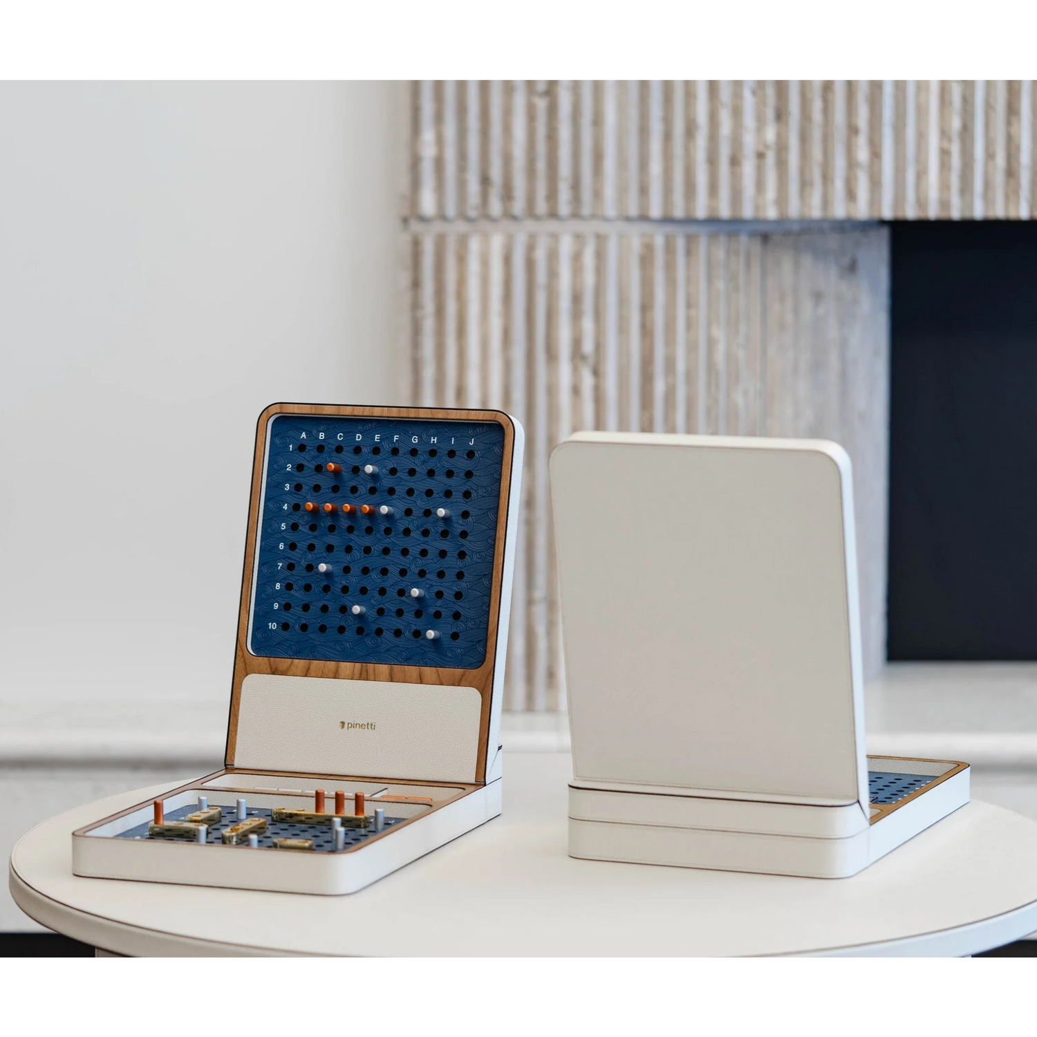 A new board game has been unlocked. The new Battleship game set by Pinetti: two walnut wood boxes with magnetic lid, covered in calf leather and ten ships made of precious shiny brass and metal pegs in two colors. The embossed waves on the game board, created through digital printing, are a true masterpiece. Contact us for more customization.