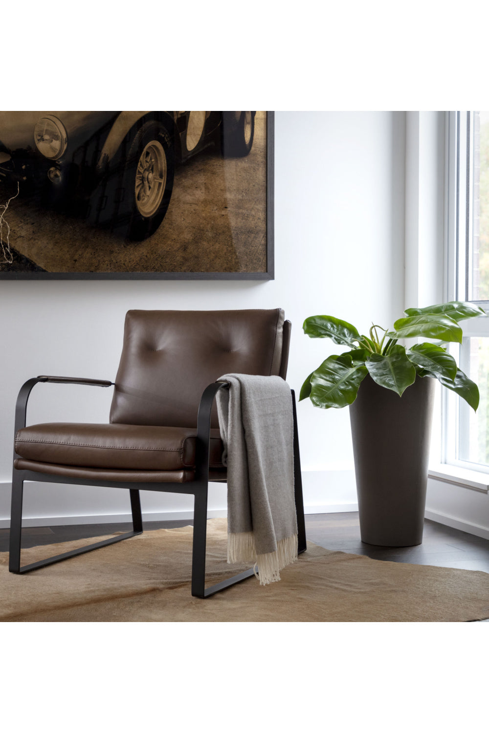 Rich with comfort and comprised of an industrial-inspired design, this mid-century modern lounge chair is perfect for any space. Features a generously-cushioned seat upholstered in missouri stone and mahogany Italian bovine leathers. Completed with matching leather wrapped armrests and black powder coated steel legs. Handle with Care: This design has been crafted with 100% leather. Leather is a natural material; as such, color variations, markings, wrinkles, grooves and light scratches are acceptable and appreciated characteristics.