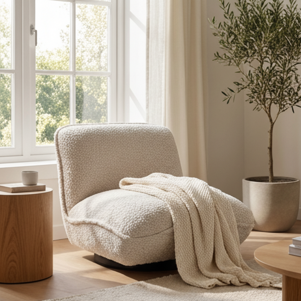 Bring soft, modern luxury to your space with the Richmond Interiors Ophelia Cushioned Easy Chair. Upholstered in a lovely cream, textured bouclé-style fabric, this armless lounge chair features a low, sculpted back and an invitingly plush seat—perfect for reading corners, living rooms, bedrooms, or boutique-style hospitality settings. A discreet black metal swivel-style base anchors the design, creating a clean, floating look while making it easy to turn and converse. Collection: Ophelia Brand: Richmond Interiors Type: Cushioned easy chair / armless lounge chair Upholstery: 100% polyester Base: Metal (black, recessed circular base) Color: Lovely Cream / off-white Dimensions: W30 x D36 x H28 in (W77 x D91 x H72 cm) Weight: 35 lb (16 kg) Style notes: The Ophelia chair’s rounded, minimalist silhouette pairs beautifully with contemporary, Scandinavian, and modern organic interiors. Use it as a statement accent chair or style two for a cozy, balanced seating moment. FAQIs this chair comfortable for lounging? Yes—its generously padded seat and supportive low back are designed for relaxed, sink-in comfort.Does it work in small spaces? The armless profile and compact footprint make it ideal for apartments and smaller seating areas.