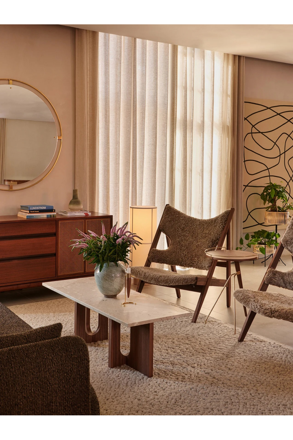 The Knitting Chair by Ib Kofod-Larsen, first launched as a limited edition in 1951, makes a triumphant return to the world of modern Danish design under Audo’s concept of “Modernism Reimagined”. This is the brand’s first foray into classic furniture. The chair’s sense of proportion and unparalleled quality makes it a natural choice to bring into contemporary interiors. The playful nature of the Knitting Chair serves to highlight its thoughtful design. Named for the elbow cut-outs that allow maximum comfort while knitting (or reading), the chair is clearly the work of a master designer.