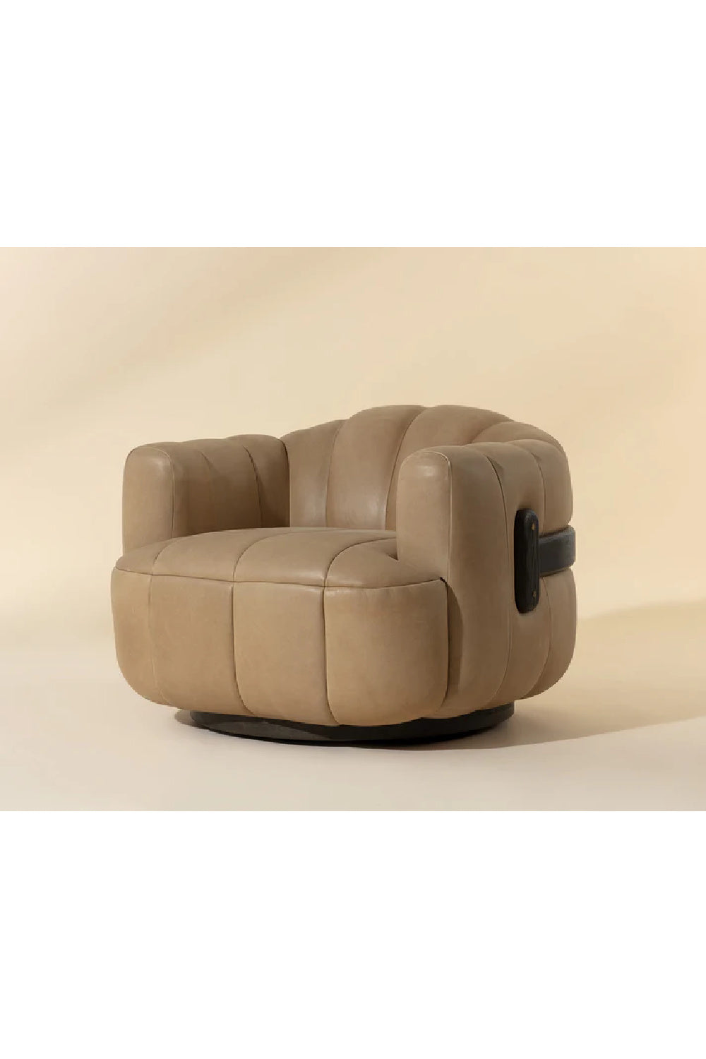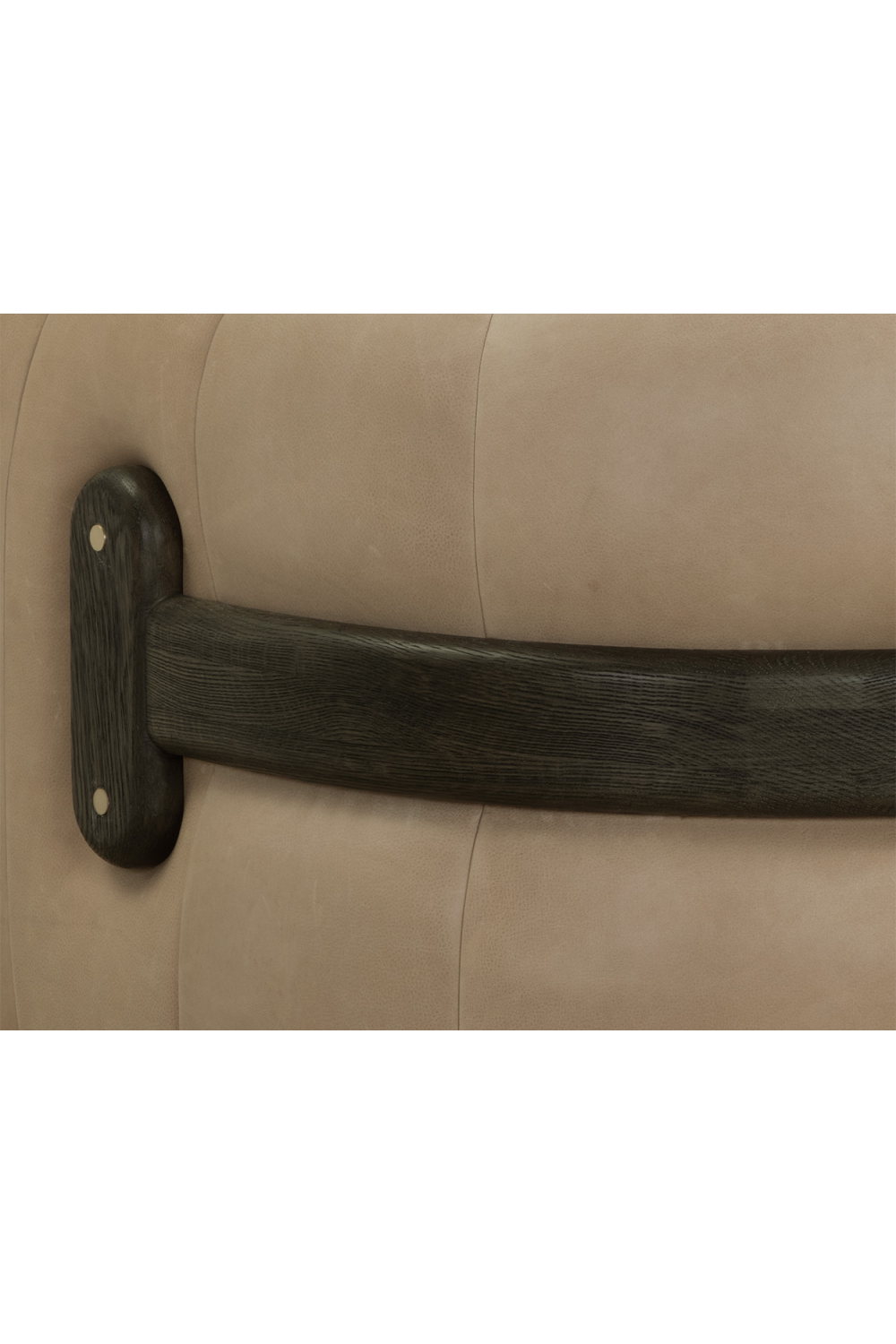 With its shapely silhouette and bolstered seating, the Tadeo Swivel Armchair takes comfort to a different level. A luxurious seat upholstered in our smooth top grain leather sits atop an oak wood base. Matching wood detailing along the back of the chair with antique brass accents give a playful yet coordinated look to the design.