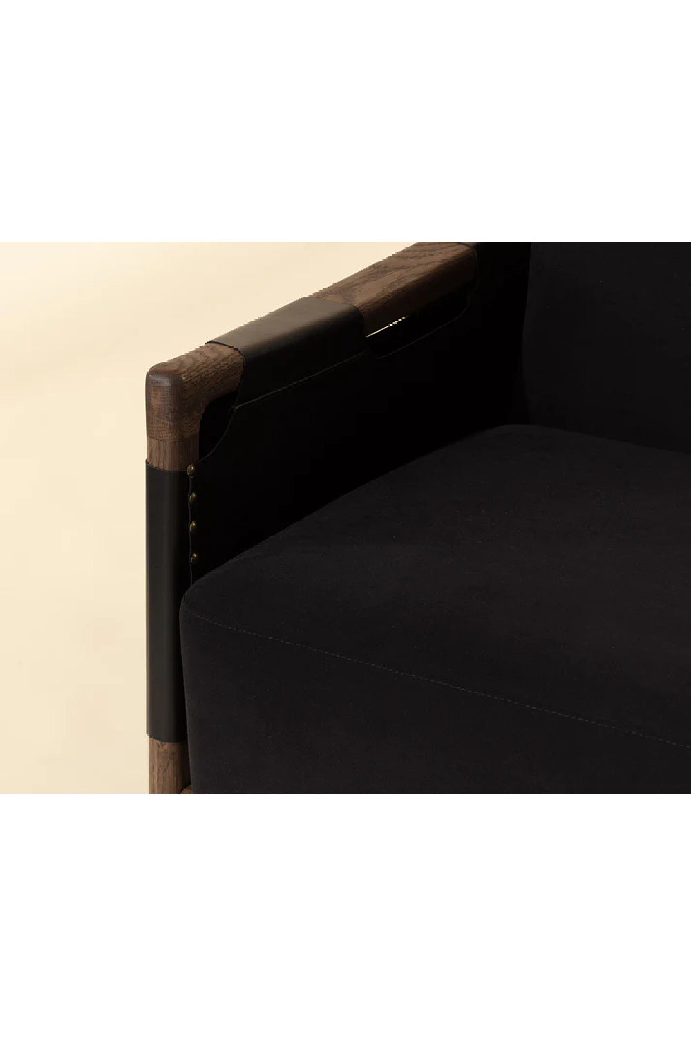 The Calloway Lounge Chair combines robust craftsmanship with inviting comfort. Its solid oak frame is accented with wide Italian leather straps, secured by hand-applied nailheads for a distinctive touch. Generous cushions are upholstered in smooth fabric, while gold-capped feet finish the piece with with a subtle note of polish.