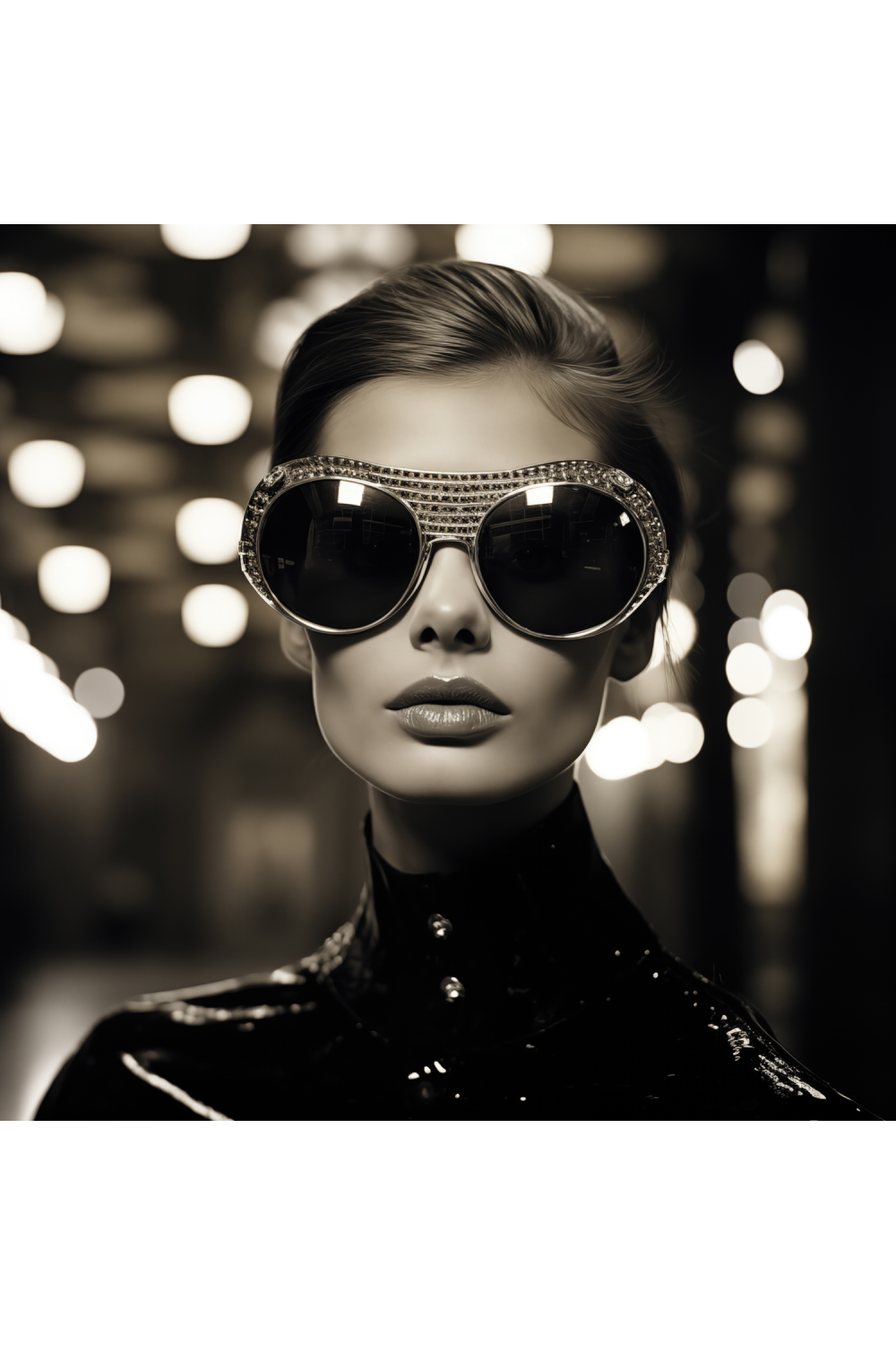 Sepia tone close-up photograph of model wearing round sunglasses. Printed onto smooth plexiglass this vibrant artwork has a sleek, glossy finish and is part of our curated collaboration with Cobra Art.
