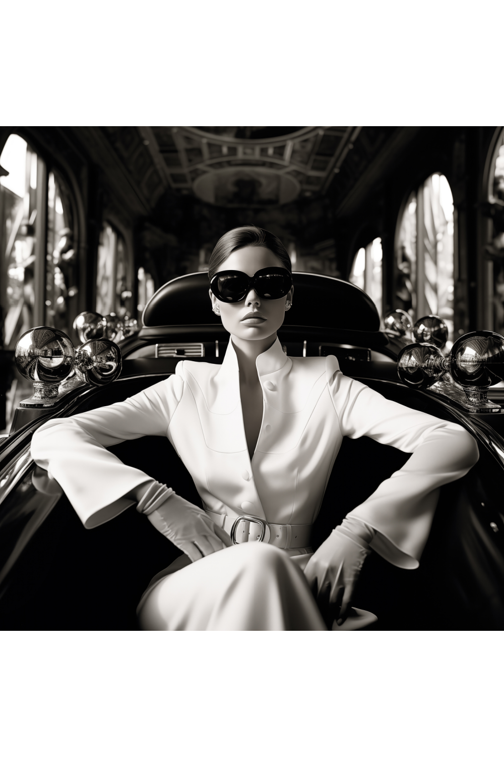 Black and white photograph of a model sitting in a car with white structured dress, gloves and black sunglasses. Printed onto smooth plexiglass this vibrant artwork has a sleek, glossy finish and is part of our curated collaboration with Cobra Art.