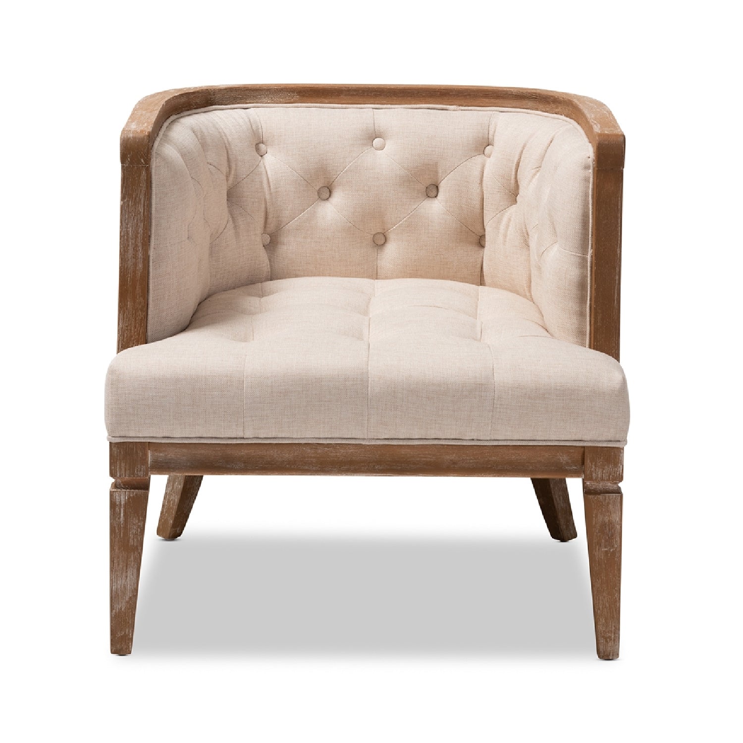 Featuring a classic silhouette and antique finish, the Esme chair is an elegant addition to any space. Constructed from solid oak wood, the Esme showcases a charming white-washed finish for an aged appearance. Beige linen fabric upholstery gives the piece an understated elegance. Inspired by traditional French furniture, the Esme features button tufting on the chair seat and back, as well as tapered legs. The wooden frame is crafted with a striking cut-out design on the back, making it ideal for placement in the center of a room. The Esme chair is made in China and will arrive fully assembled.