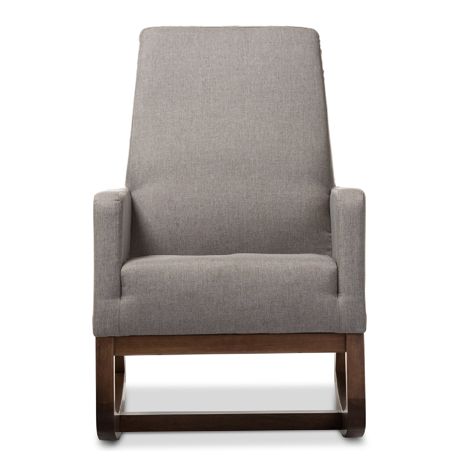 Inspired by mid-century modern design, the Yashiya rocking chair has blended the retro feel of a vintage upholstered rocking chair with the quality, made-to-last design you'd expect from a modern piece of furniture. The result is our exclusive Yashiya Rocking Chair. Featuring polyester fabric and a sturdy wood frame in a beautiful walnut finishing, this retro rocking chair feels right at home in a nursery, living room or any shared space. High back contoured design and ergonomic arm height add more charms to this piece. The Yashiya looks smart, modern, but comfortable can be a good rocking chair for nursery during middle of the night feedings and yet a pretty piece of furniture to accent the room. Made in Malaysia, the Yashiya requires assembly.