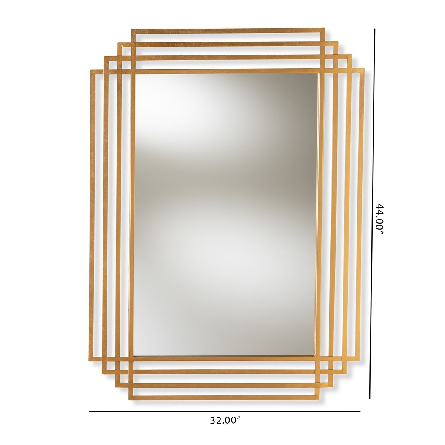 Give any room a more luxurious feel with the antique gold metal ware and ornate frame of the Kalinda wall mirror. Constructed of high-quality metal with a sturdy wood backing, the Kalinda features mirrored glass for exceptional clarity in every reflection. Inspired by Art Deco design, the mirror showcases four overlapping rectangles for an intricate and striking display. Antique gold finishing on the frame brings a touch vintage luxury to your space.