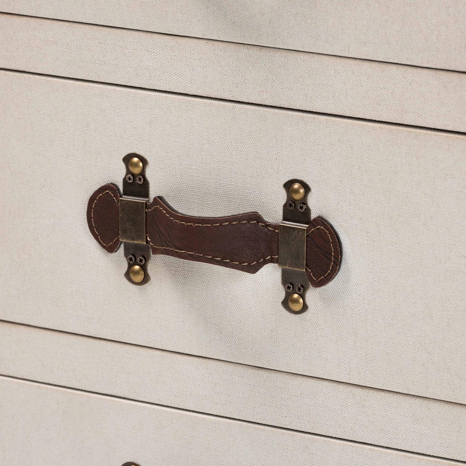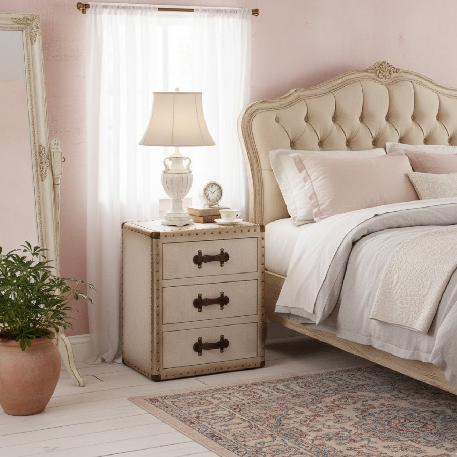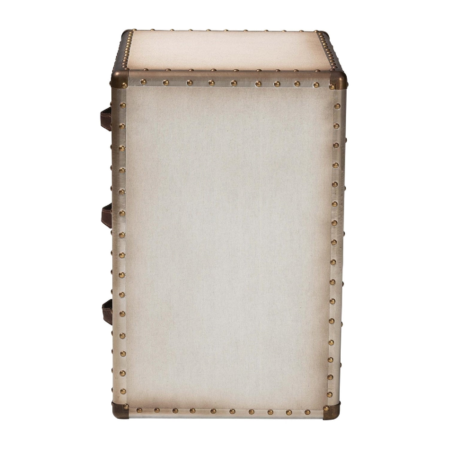 Vintage charm springs forth in the form of the stunning Mallison end table. This traditional piece consists of a sturdy wood frame wrapped in smooth canvas. Three drawers offer convenient storage for household essentials while reserving the tabletop for daily use. The Mallison will arrive fully assembled and is affixed with metal bands studded with nail heads for an extra dose of industrial charm. Leather handles complete the look, making the Mallison end table an eccentric addition to any setting.