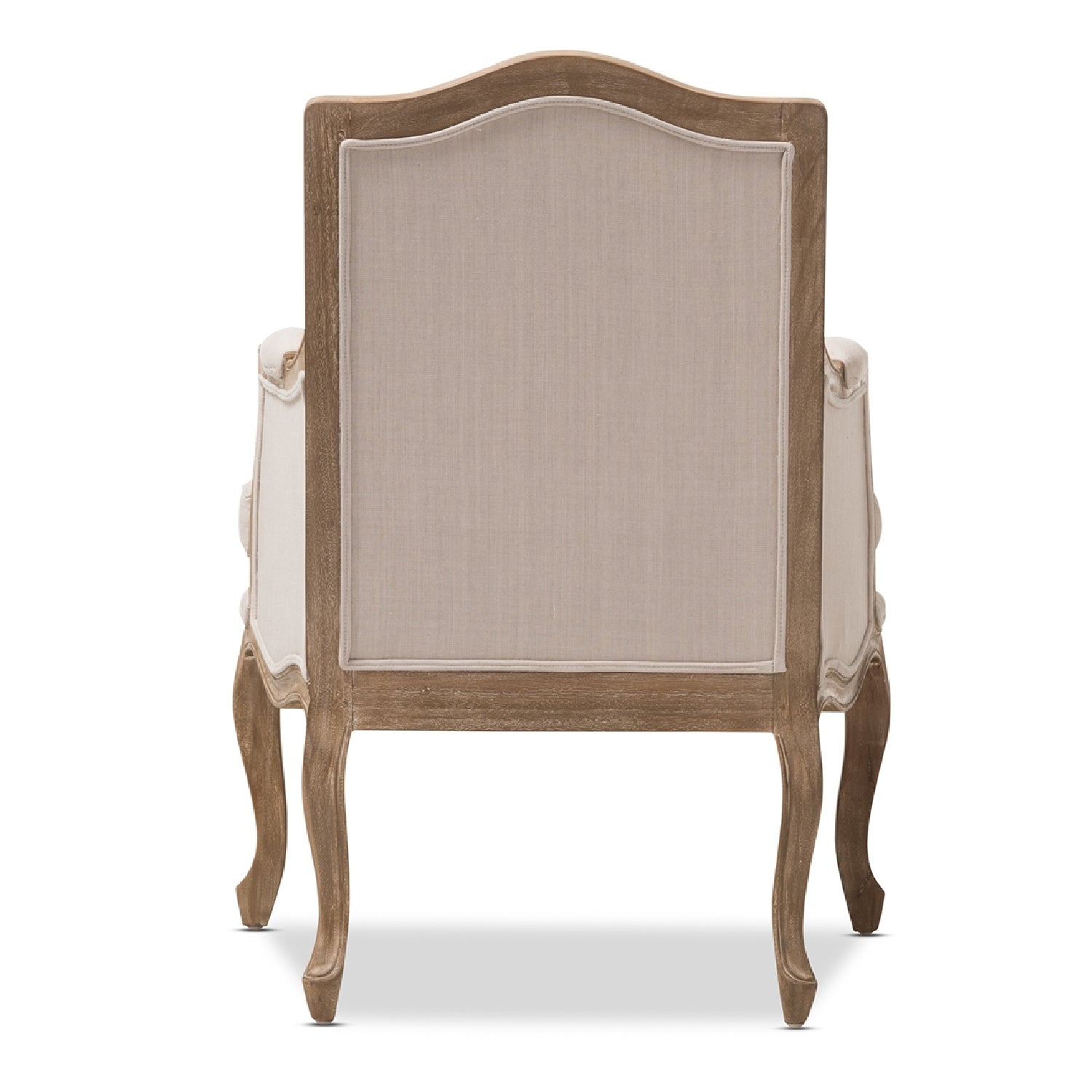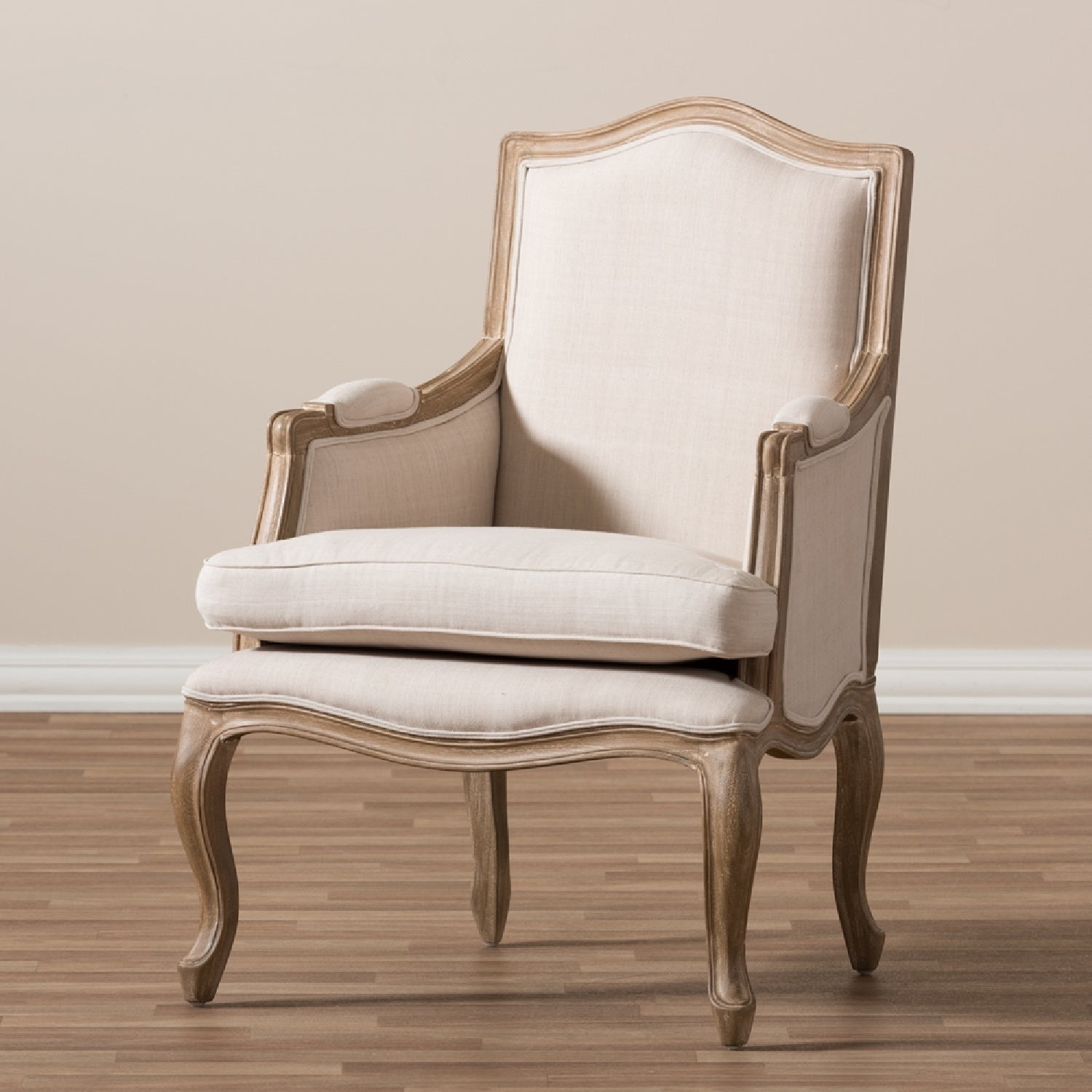 Revealing outstanding attention to detail via its white-streaked, distressed antiqued finish, our Nivernais Wood Traditional French Accent Chair will gain enthusiastic applause from discount-minded decorating divas. Bringing traditional style to the modern age, this accent chair pairs a genuine mindi-wood frame with Highly versatile neutral beige linen. Foam cushions provide comfort without sacrificing style.