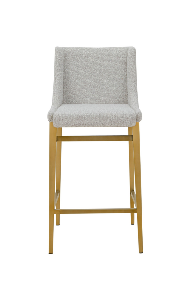 The Mimi Counter Stool is a beautiful modern piece of furniture. The sloped arms match height perfectly with the high back of the chair, creating a stylish silhouette. Upholstered in a soft gray polyester fabric, this chair is comfortable and stylish. The antique brass finished legs have modern lines and contrast the soft fabric. The Mimi counter stools can be paired with any style and look right at home. The Mimi collection also includes a matching Dining Chair.