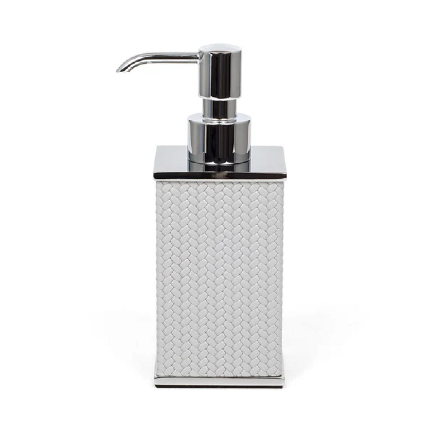 Elevate your bathroom with the Pinetti Olimpia set, featuring a leather-covered small tray, square soap dispenser, and toothbrush holder. This collection combines clean, crisp lines with luxurious chrome, gold, and burnished brass accents, perfectly complementing the refined leather upholstery. Designed to bring understated elegance, it’s an ideal addition to enhance the sophistication of your powder room or master bathroom.
