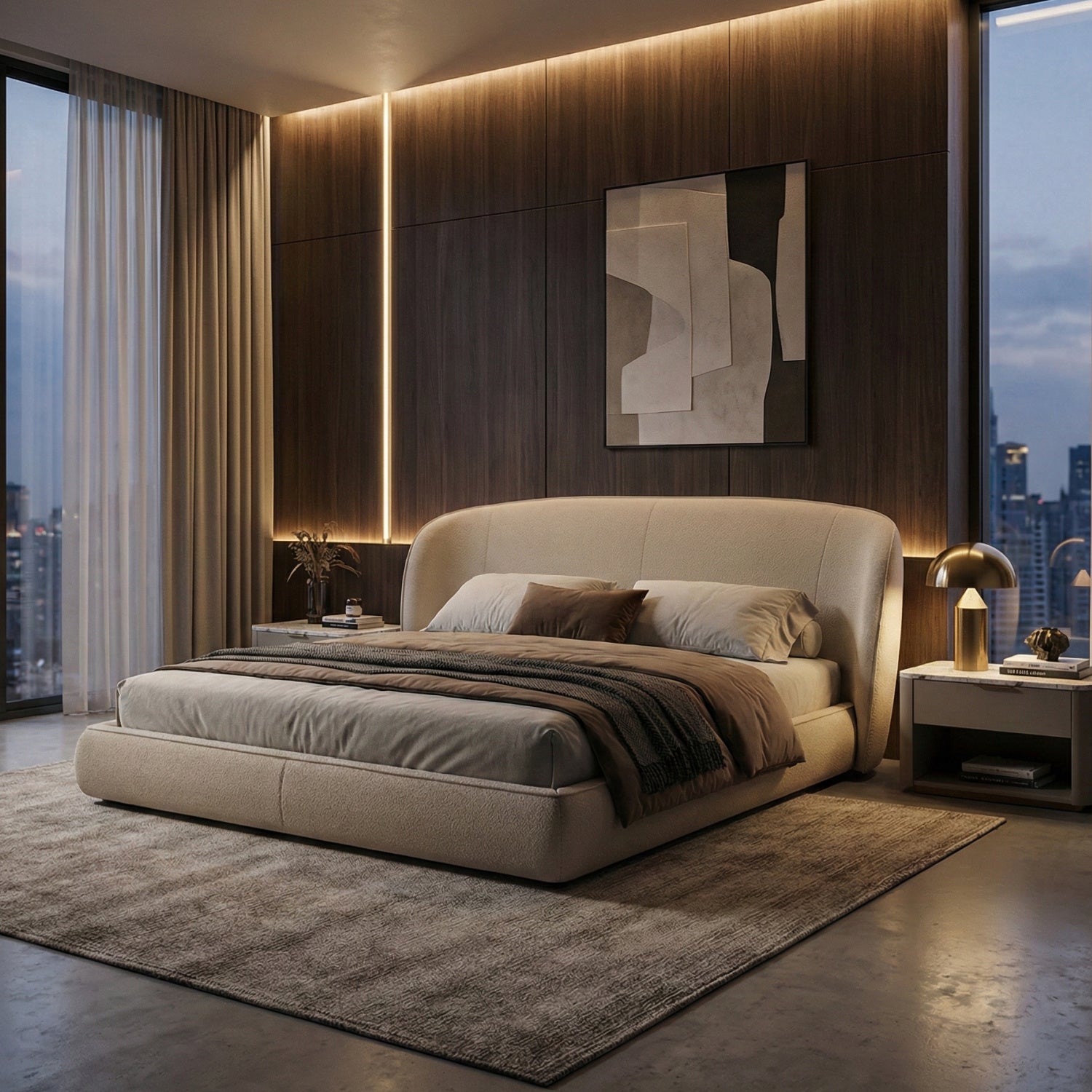The Lambert bed redefines luxury with its glam design and stunning upholstery. This bed is upholstered in a comfortable teddy beige fabric, has a rounded headboard with a platform base- no box spring required! The simple yet sophisticated design of this modern bed will allow you to sleep in luxury.