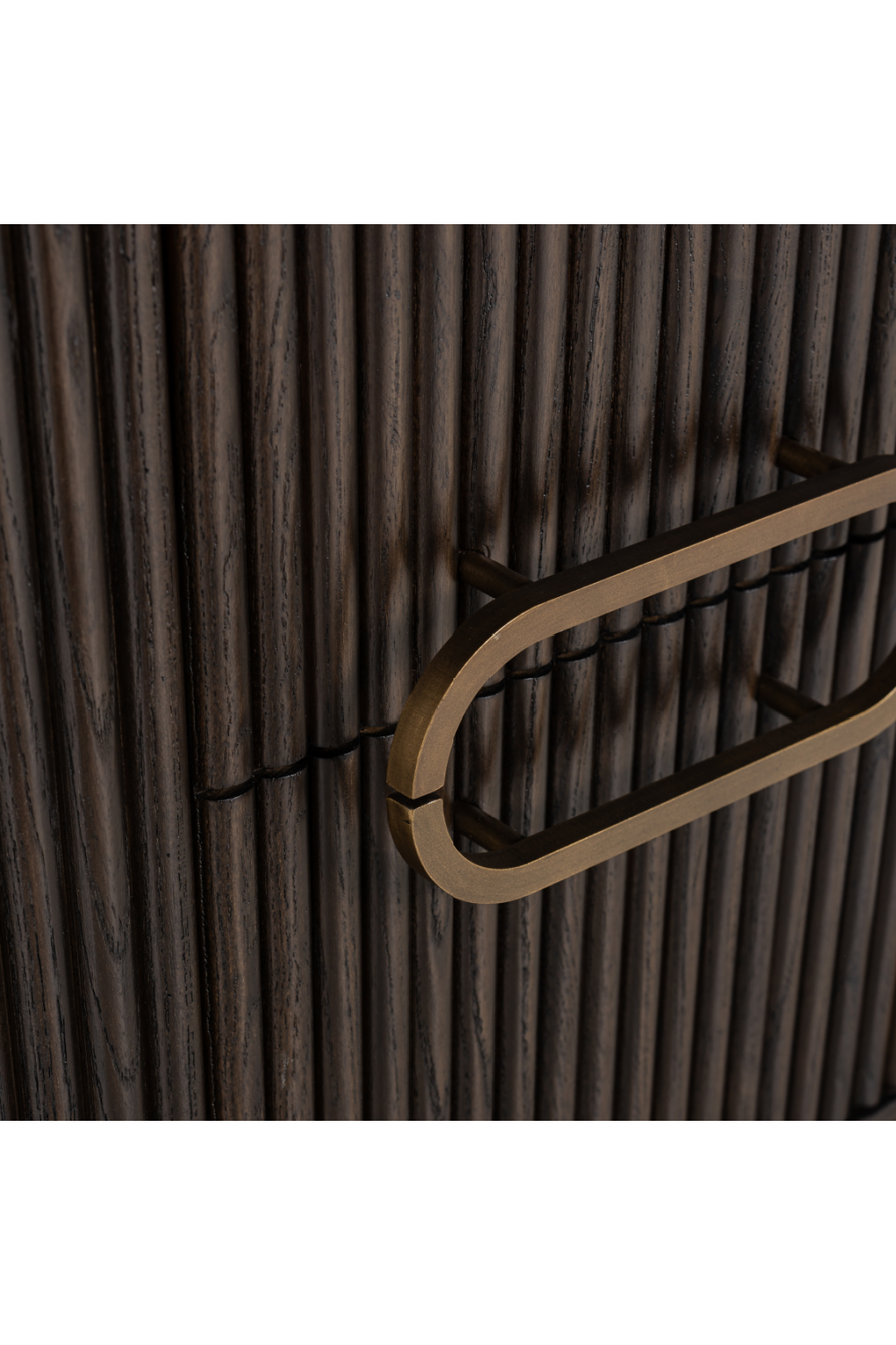 A chic one-door cabinet crafted from oak wood in a dark finish and vintage brass metal accents. Luxor by Richmond Interiors features a unique aesthetic with its oval top and softly ridged veneers. It offers two layers of storage space to organize your essentials.