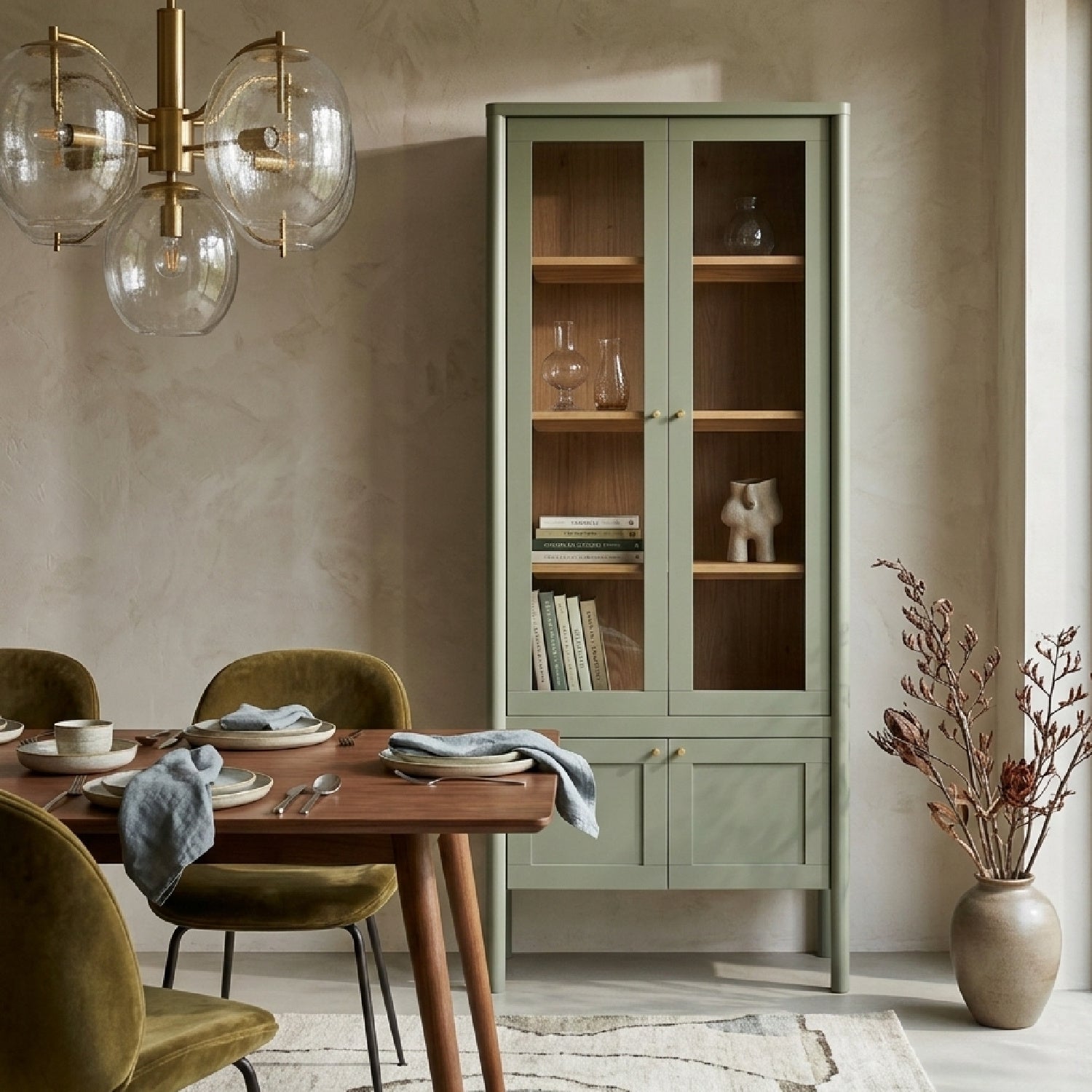 Thoughtfully designed, the Hannah cabinet balances transparency and concealment with tempered glass inserts. Crafted from solid pine, dowel legs and understated bronze hardware add a subtle softness, while the versatile finish complements diverse interior styles.