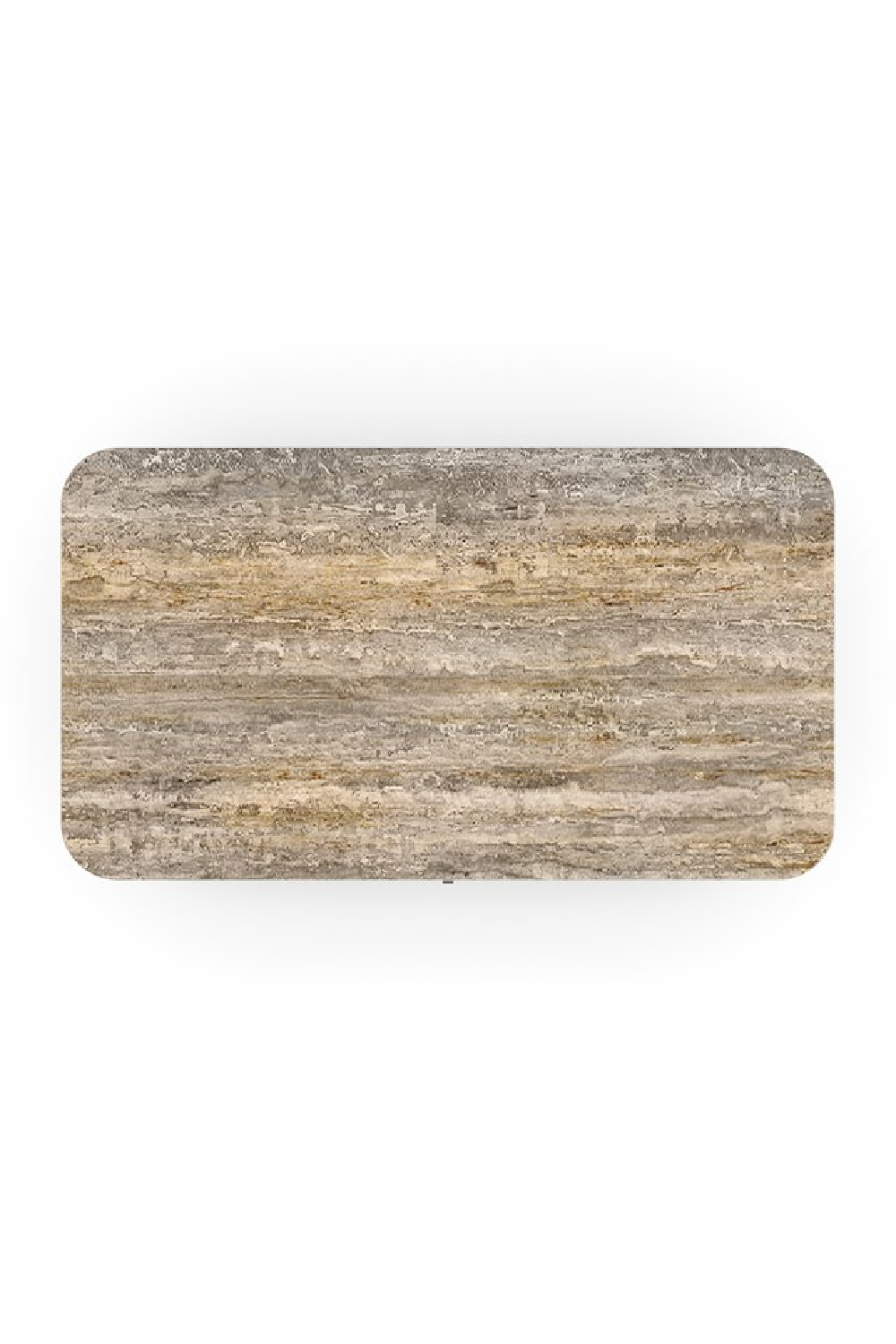 The natural beauty of travertine stone is punctuated by the visual rhythm of reeded drawer fronts in a Black Stained Ash finish. Rounded corners and bronze drawer pulls with a subtle contour soften its linear form and add a touch of warmth. Features painted drawer interiors and access along the back for wire management.