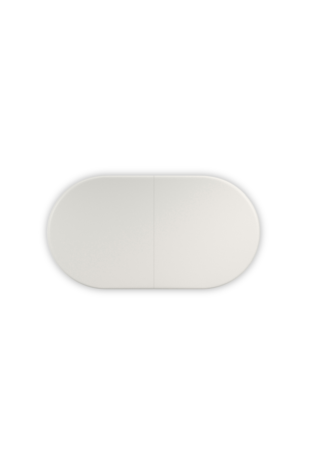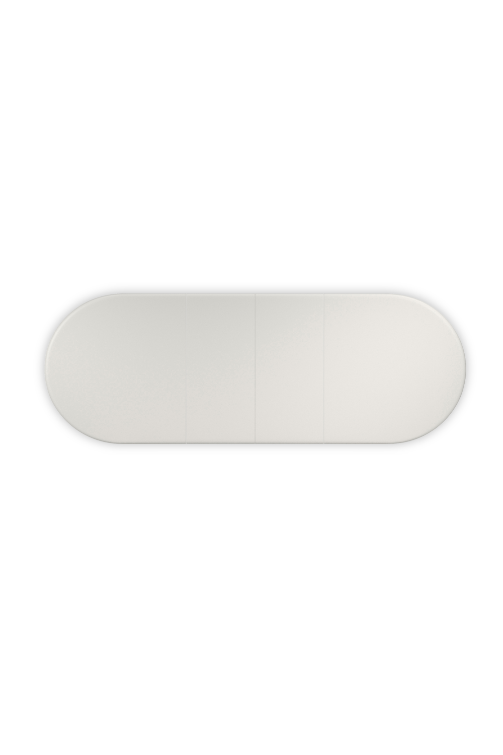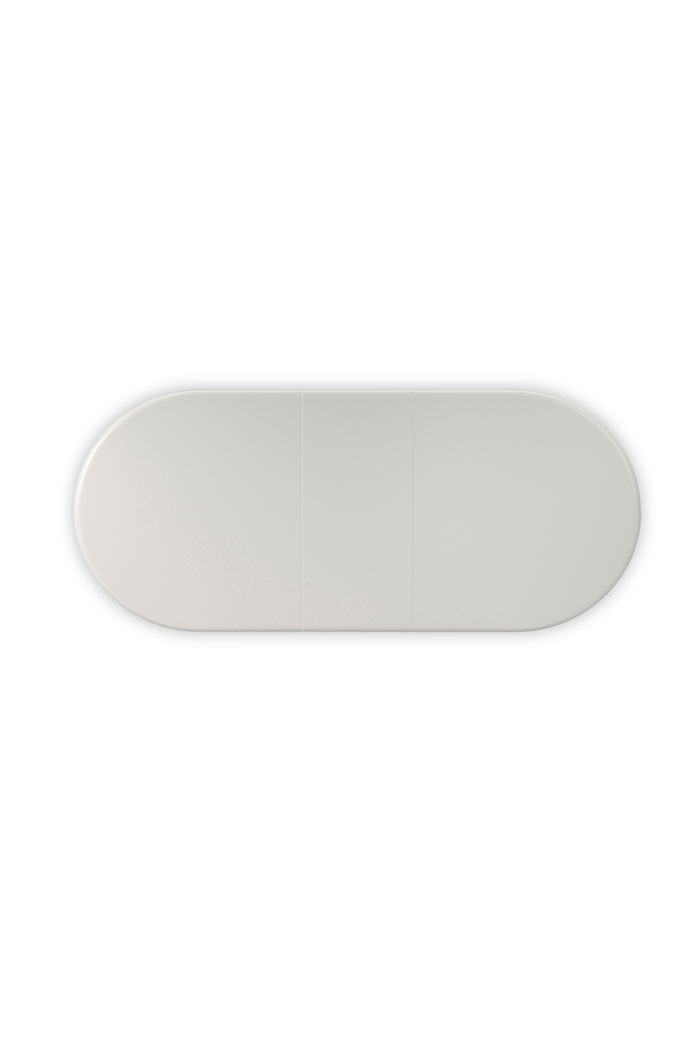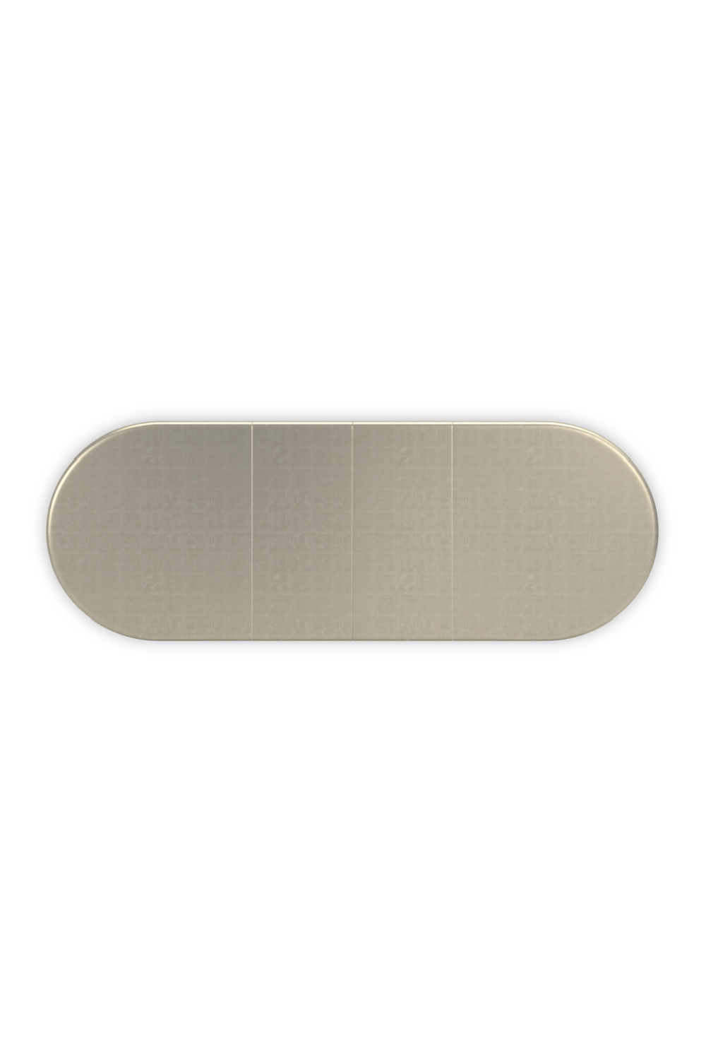 With an elegant oval shape, this large dining table rests upon a two-piece, round barrel base that showcases delicate vertical reeds around its sides. The base can be separated to reveal flat sides with dramatic, reflective Whisper of Gold plates. Its top is finished in beautiful Matte Pearl, Oracle, and Dark Chocolate, trimmed with a Whisper of Gold metal band. Comfortably seats 12 when extended.