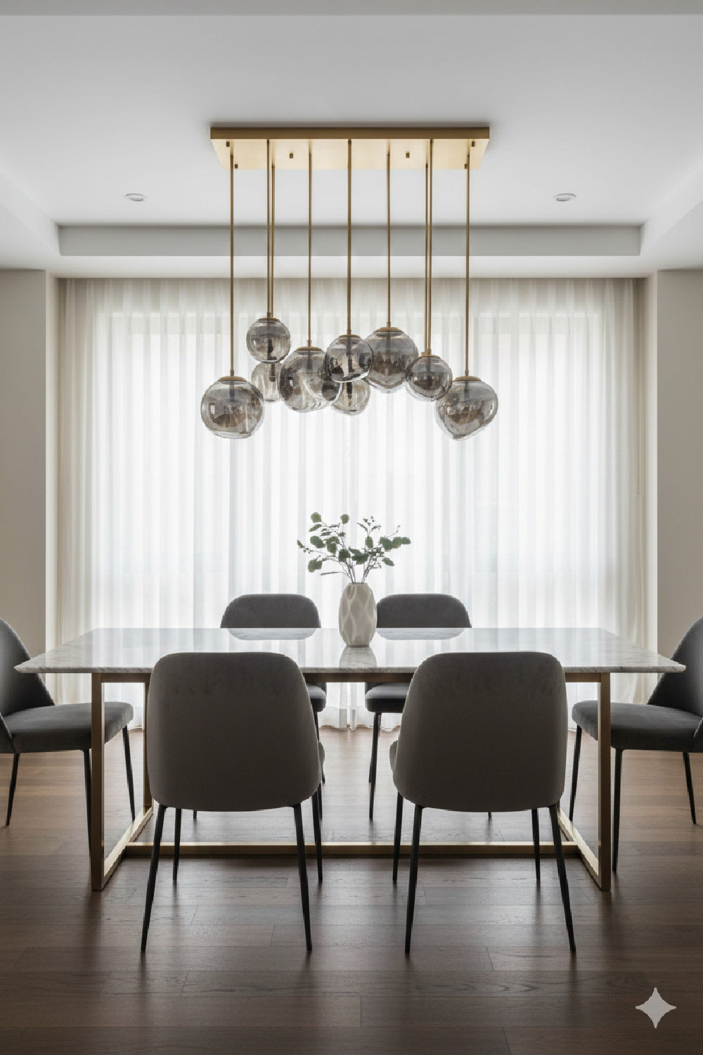 The Dionis Chandelier combines the refined look of hand-blown glass with contemporary appeal. Suspended from a brushed gold iron fixture are glass globes in dual sizes that are artfully arranged to produce a lustrous glow.