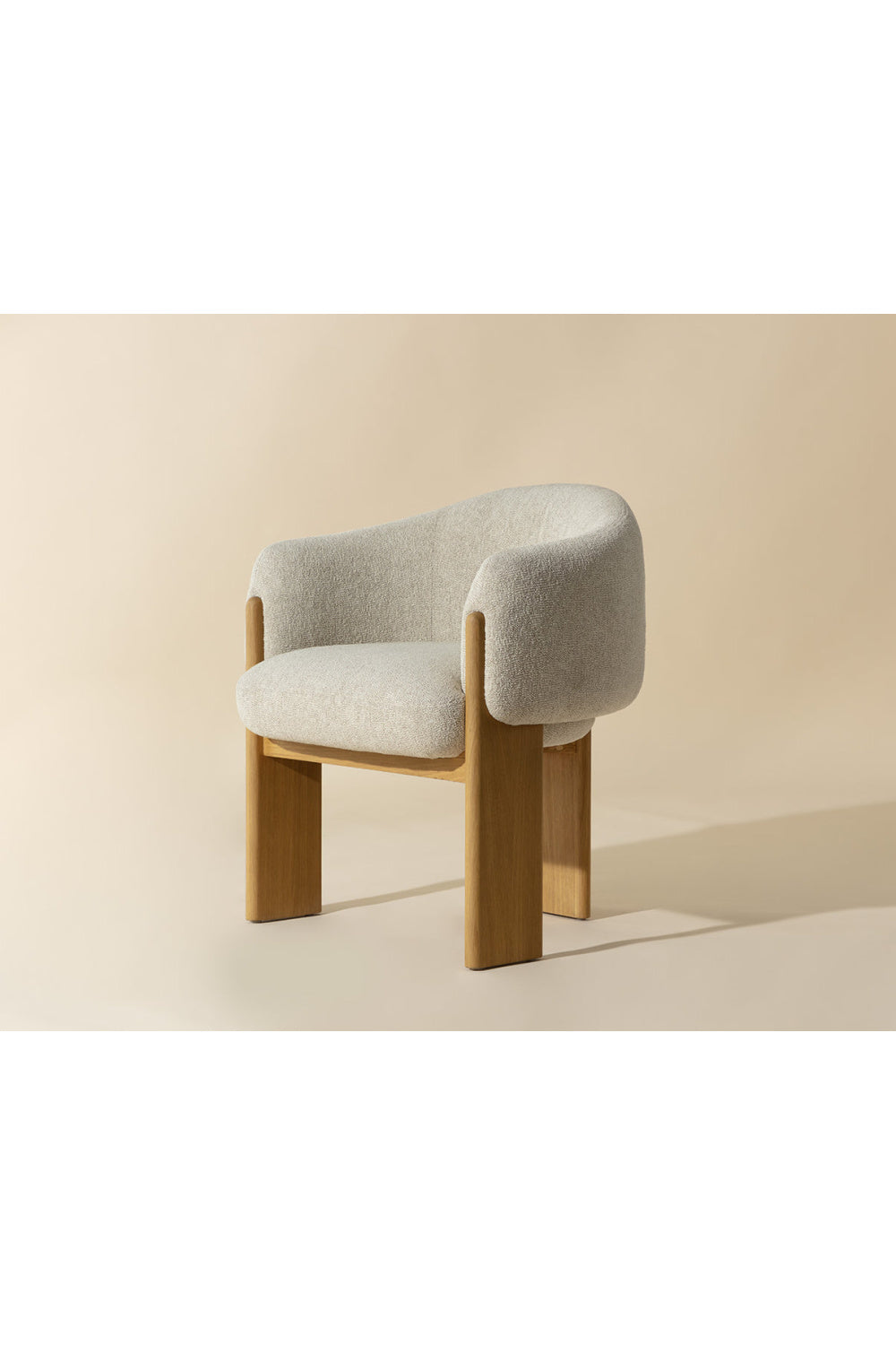 Embrace the luxurious comfort of the uniquely shaped Trine Dining Armchair. Generously padded and upholstered in our stylish dove cream fabric, this piece will complement any home aesthetic. Completed with a rustic oak wood base with a cerused finish on the legs.