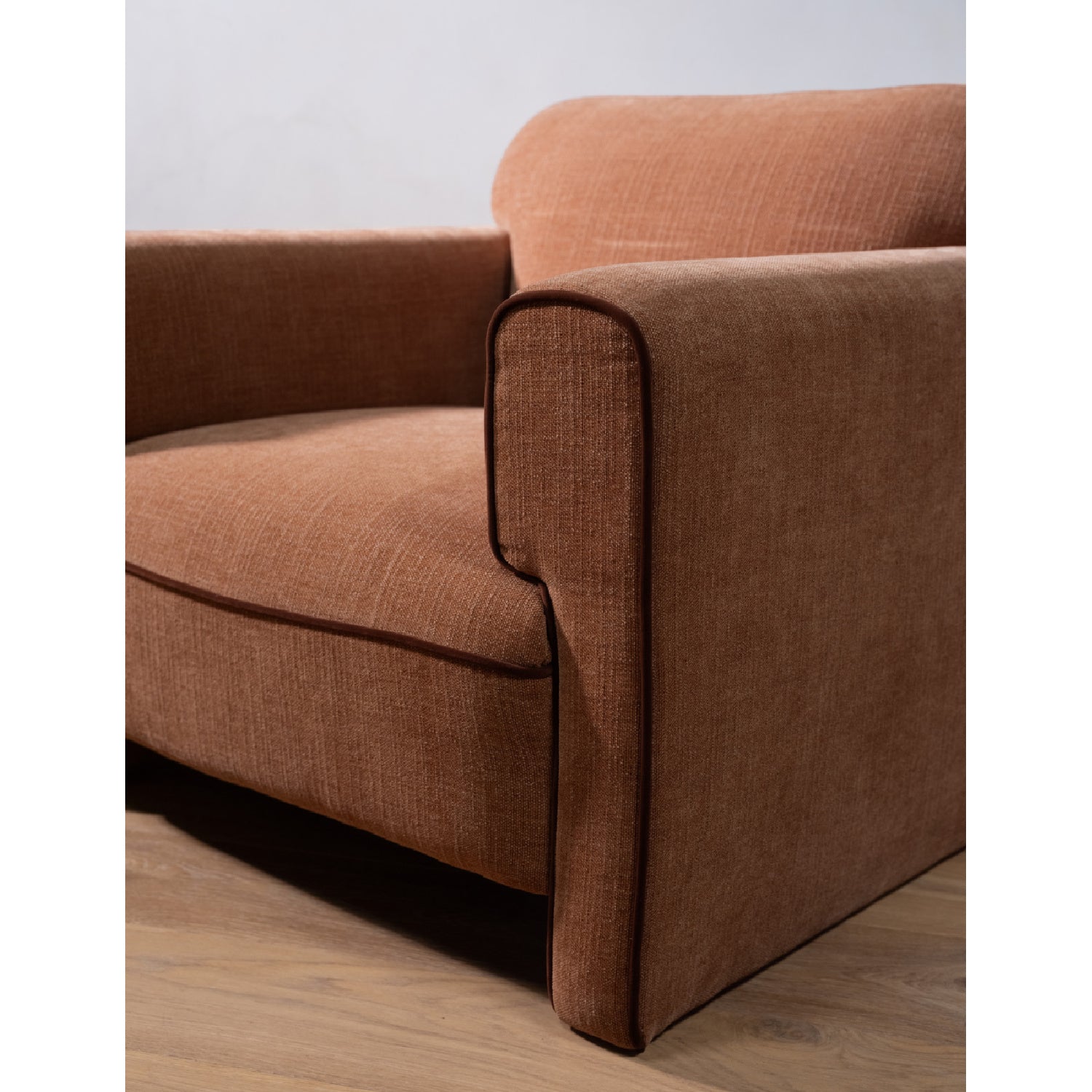 The Leo accent chair is a statement in modern design with its striking form and geometric pattern. This piece elegantly plays with curved and straight lines, as its squared side profile contrasts inward rolled arms and curved back. It offers a sophisticated silhouette accented with tonal contrast piping and fully upholstered legs.