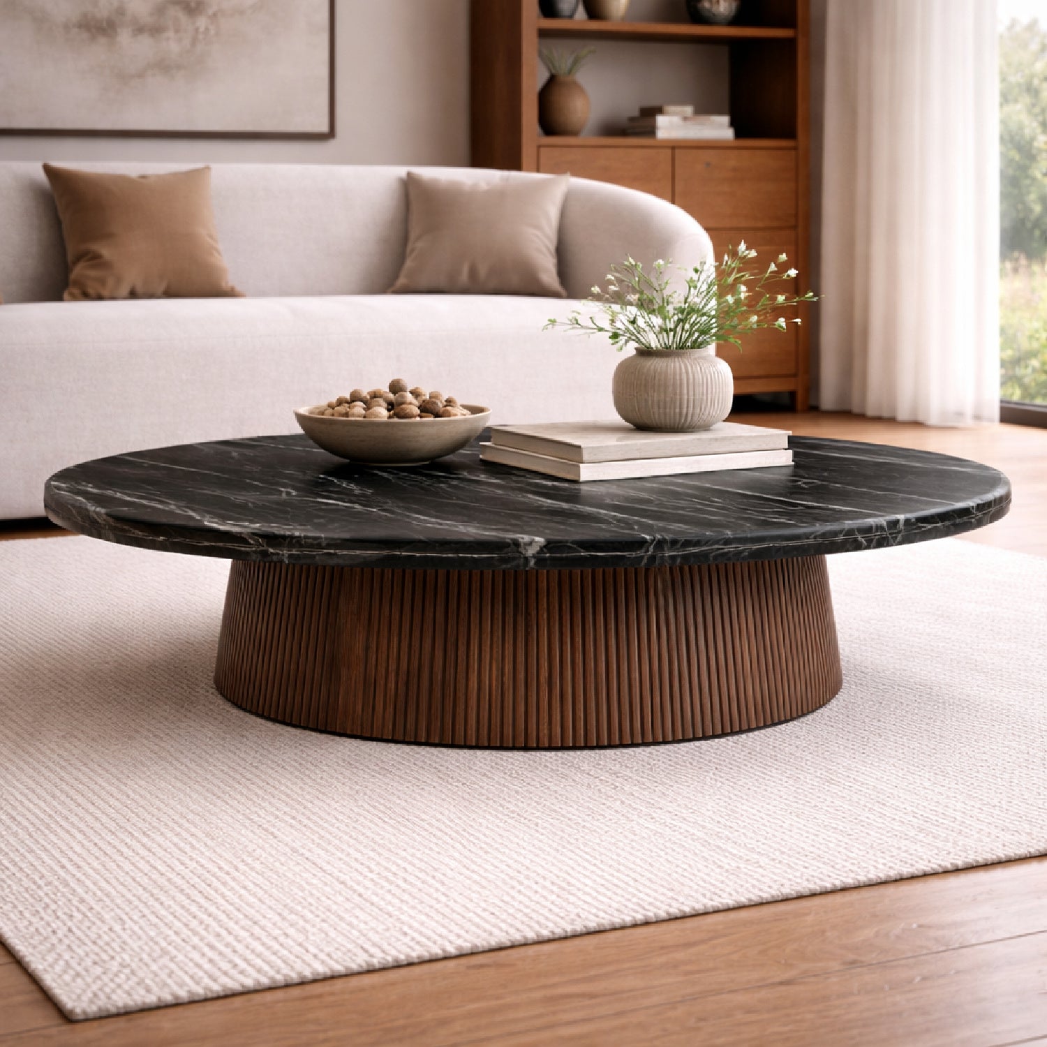 Maxim coffee table by Eleonora carries with it such a fine charm. With an oval black marble top and mango wood pedestal base, this piece is a stylish and functional item to add to your home.
