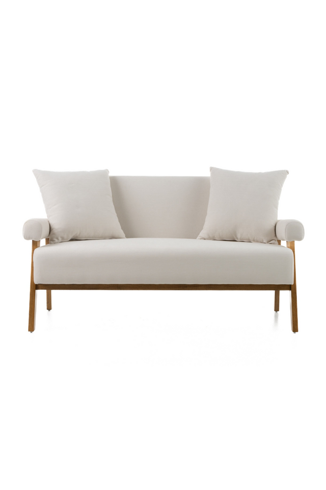 Modrest Cynthia - Modern White Fabric + Wood Loveseat is a stylish and comfortable seating option that accommodates up to two people. It is upholstered in 100% polyester fabric in a crisp white color, featuring a solid rubberwood and manufactured wood frame in a light chestnut finish. The loveseat includes two toss pillows and has a pillow back design with round arms, offering both aesthetic appeal and cozy comfort. With a weight capacity of 400 lbs., this loveseat is fully assembled and easy to maintain, making it a great addition to any modern living space.