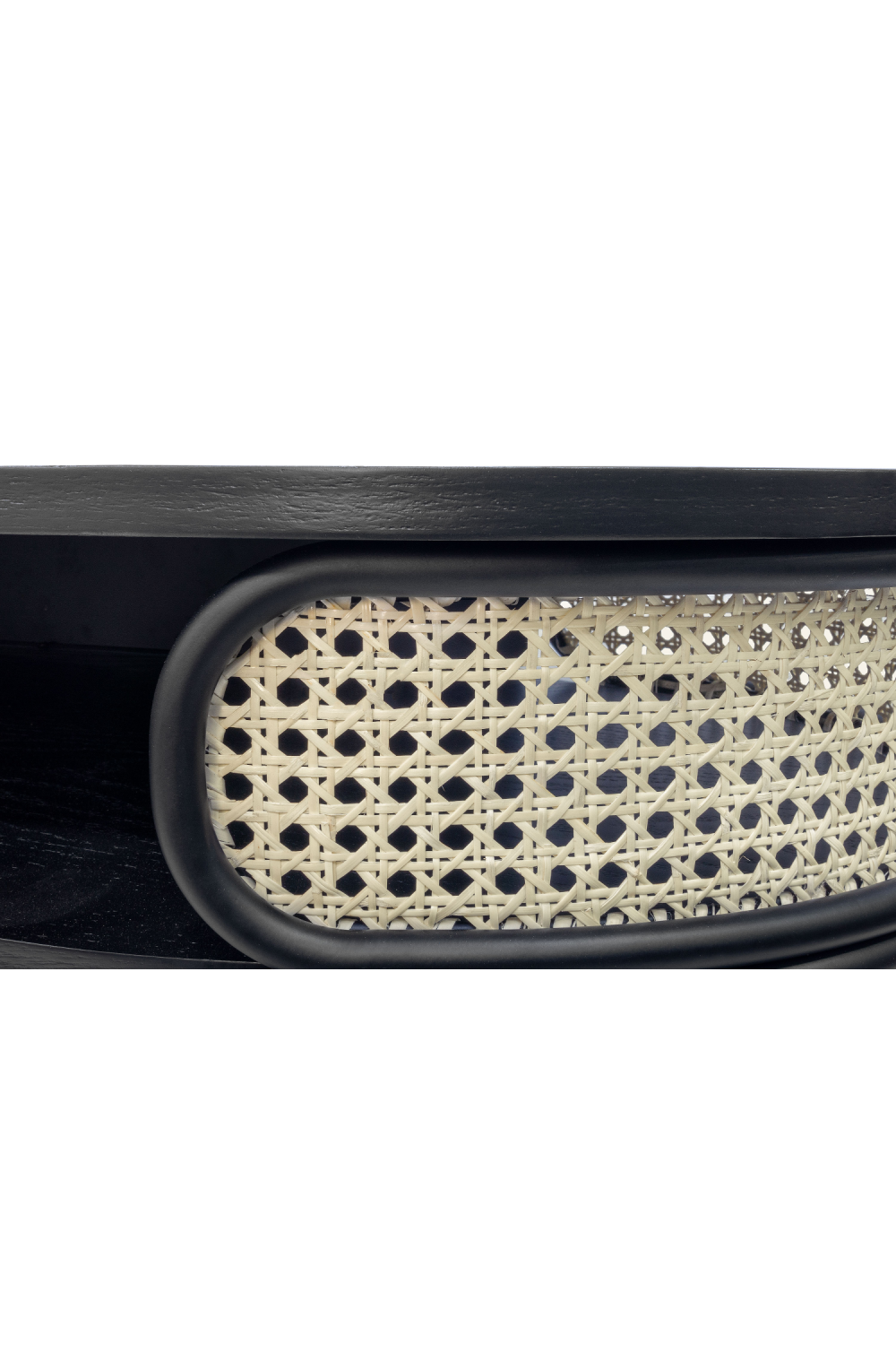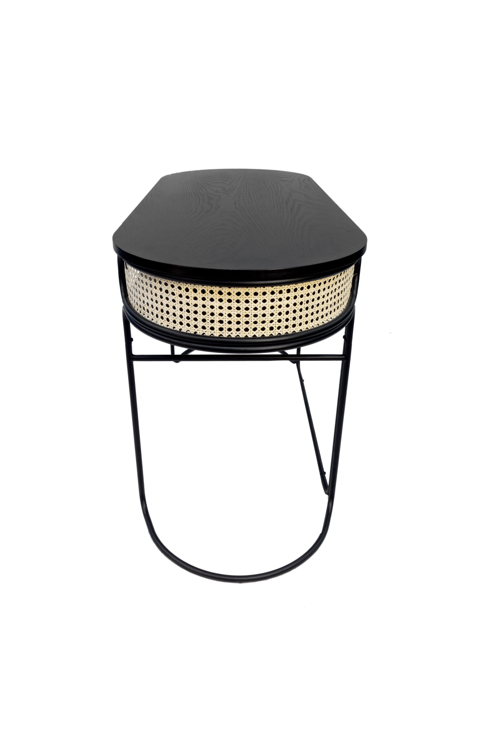 Modern industrial meets natural elegance with the Versmissen's Hoops Desk. Crafted with black oak veneer and sturdy steel, its oval surface offers both style and function. What sets it apart is the exquisite trellis of woven rattan adorning the frame, adding a touch of organic beauty to its contemporary design. Whether gracing a home office or enhancing a chic bedroom, this desk effortlessly combines durability with aesthetic appeal.