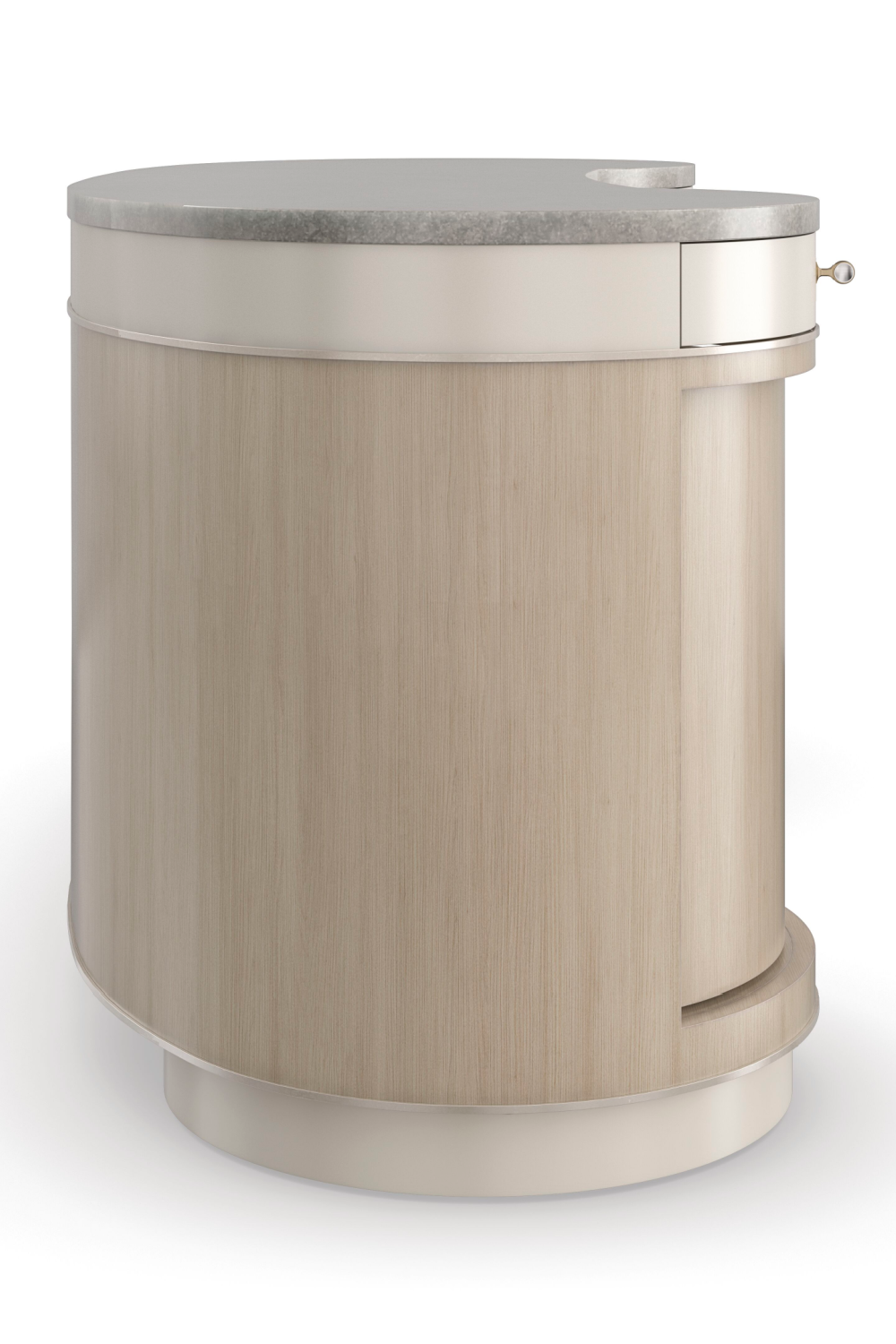 A timeless tribute to our love affair with beauty, Vanity Fair recalls a time when getting ready for a night out required a special table for dressing. An extravagant mix of materials accentuates its classic, kidney bean shape, topped in gray Armani marble and supported by Koto veneered columns. Adding to its allure: curved swivel door fronts in Charcoal Leaf, softly contrasted by three top drawers in a calming Cloud finish. Features painted interiors with a round swivel shelf and a Brushed Gold metal gallery for keeping beauty essentials. Designed with today’s function and scale in mind, it also makes an elegant desk.