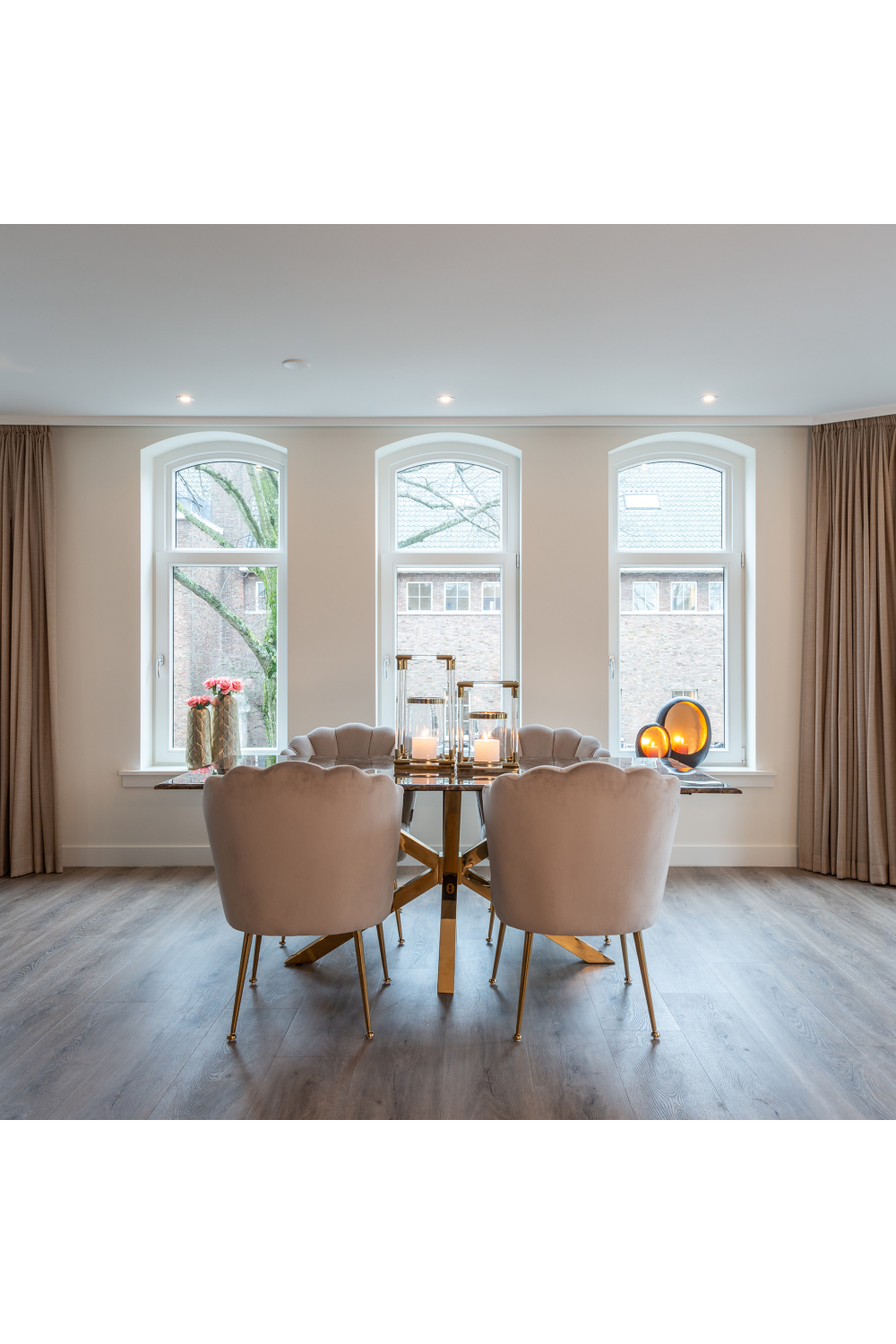 This velvet chair Pippa by Richmond Interiors boasts of its luxurious style and high quality materials. The chic backrest is reminiscent of a dainty seashell, adding a hint of nautical charm. Its golden, flared legs glamorously wrap up the design.