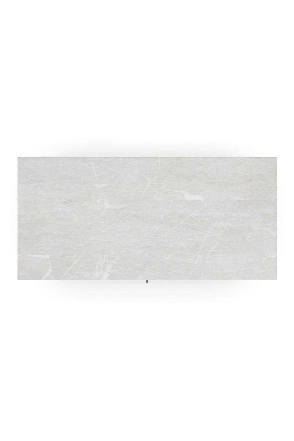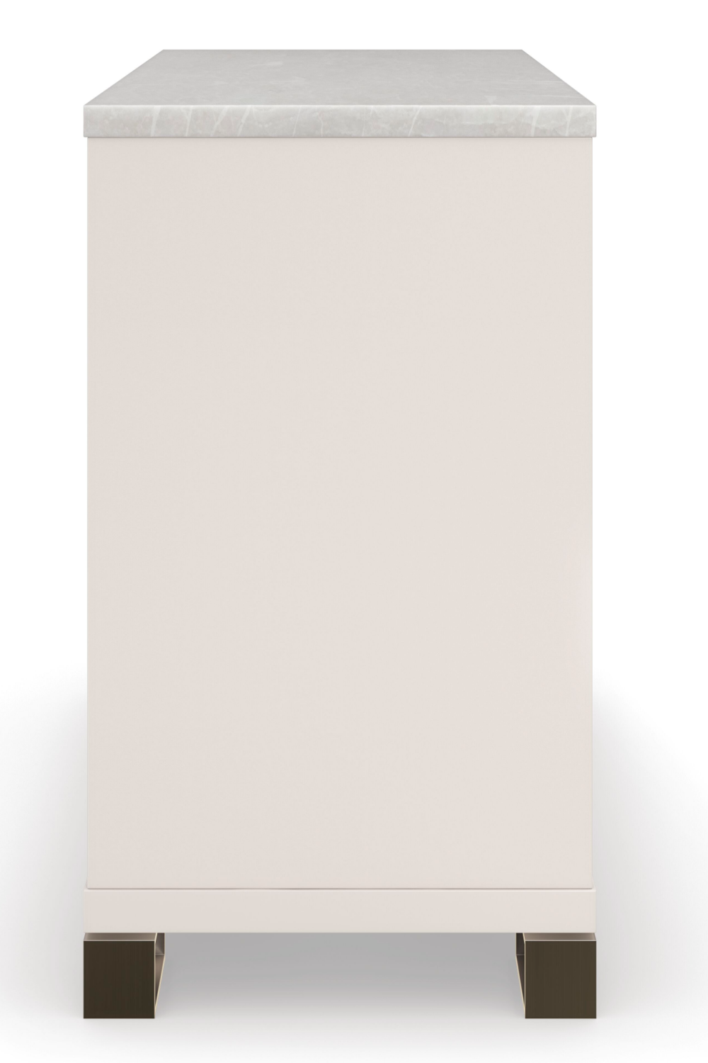 Elevated on a Greek key plinth base, this architecturally inspired dresser mixes subtle details with intentional materials to make an enduring statement. A pearlescent Moonstone finish gives light to drawer fronts, intricately crafted with Koto Veneers to create an alternating Chevron pattern. For added dimension, a gentle curve casts a slight shadow along the outside edges, emulated by vertical blade hardware in a Smoked Stainless finish. A White Rhino marble top lends a classic finishing touch to its Pearly White case.