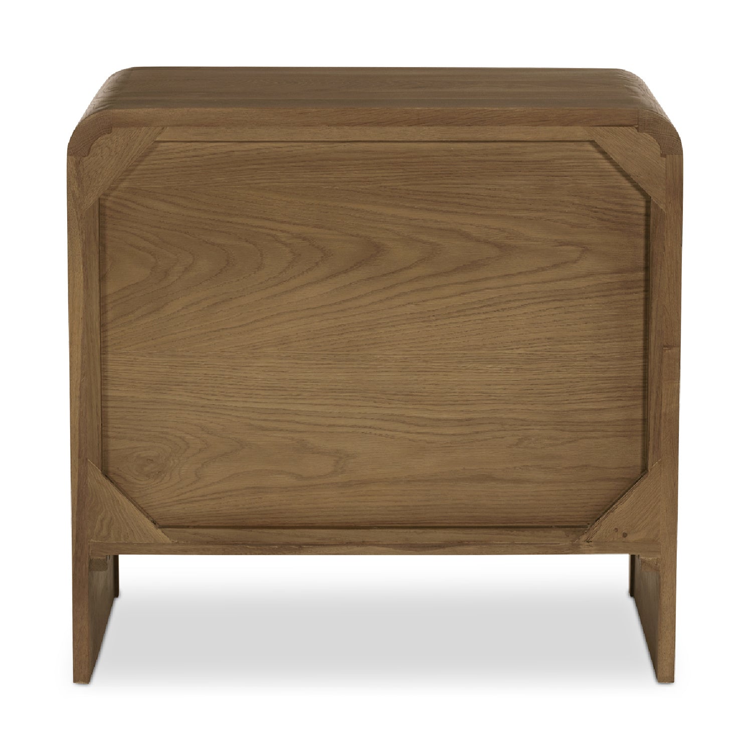 Featuring a unique waterfall edge and overhang detailing, the Riley nightstand offers captivating visual interest, underscored by its solid oak construction. The seamless design is a timeless blend of sophistication and practicality, with ample two-drawer storage.
