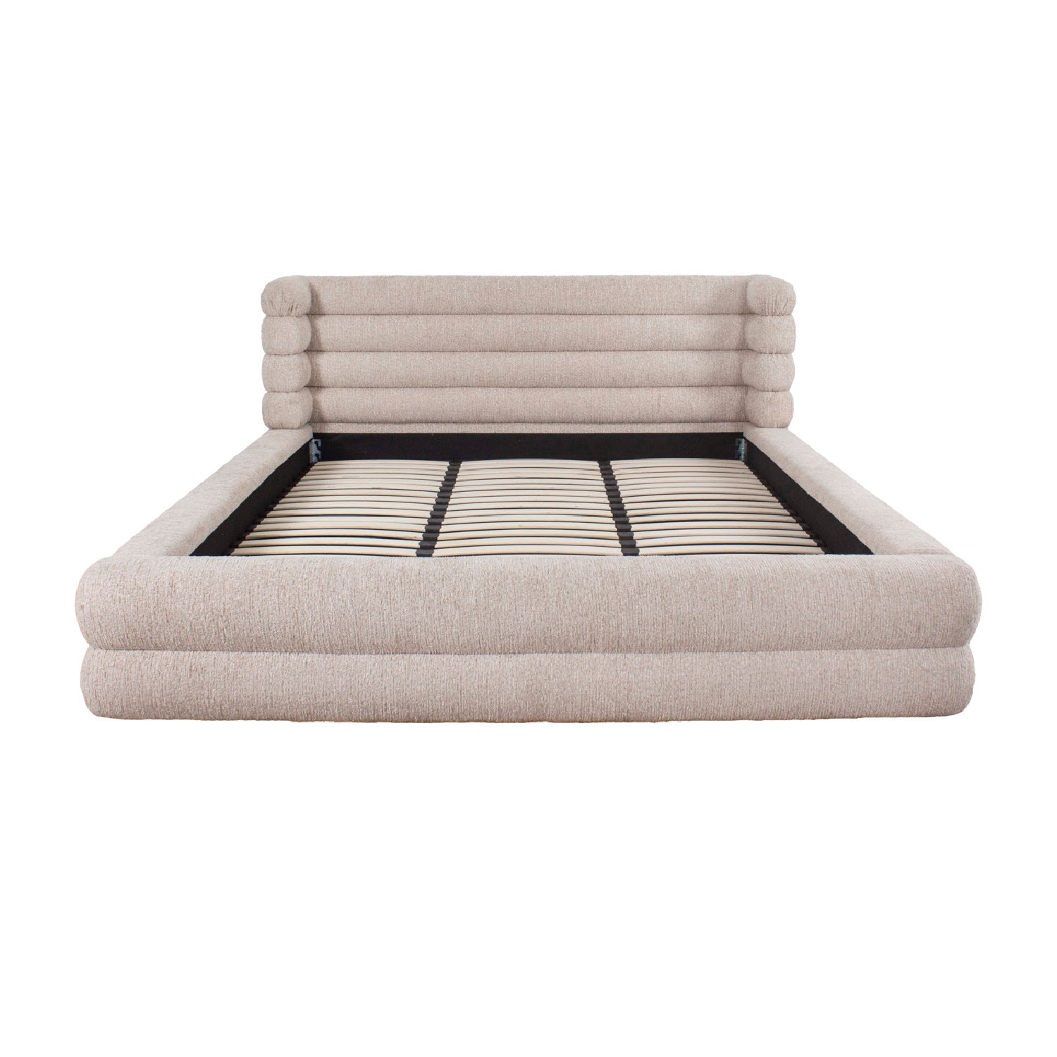 This bed features a spacious, straight-lined design with a fully upholstered appearance. The fabric shows a natural, light texture that creates a calm atmosphere. Integrated storage is discreetly incorporated.