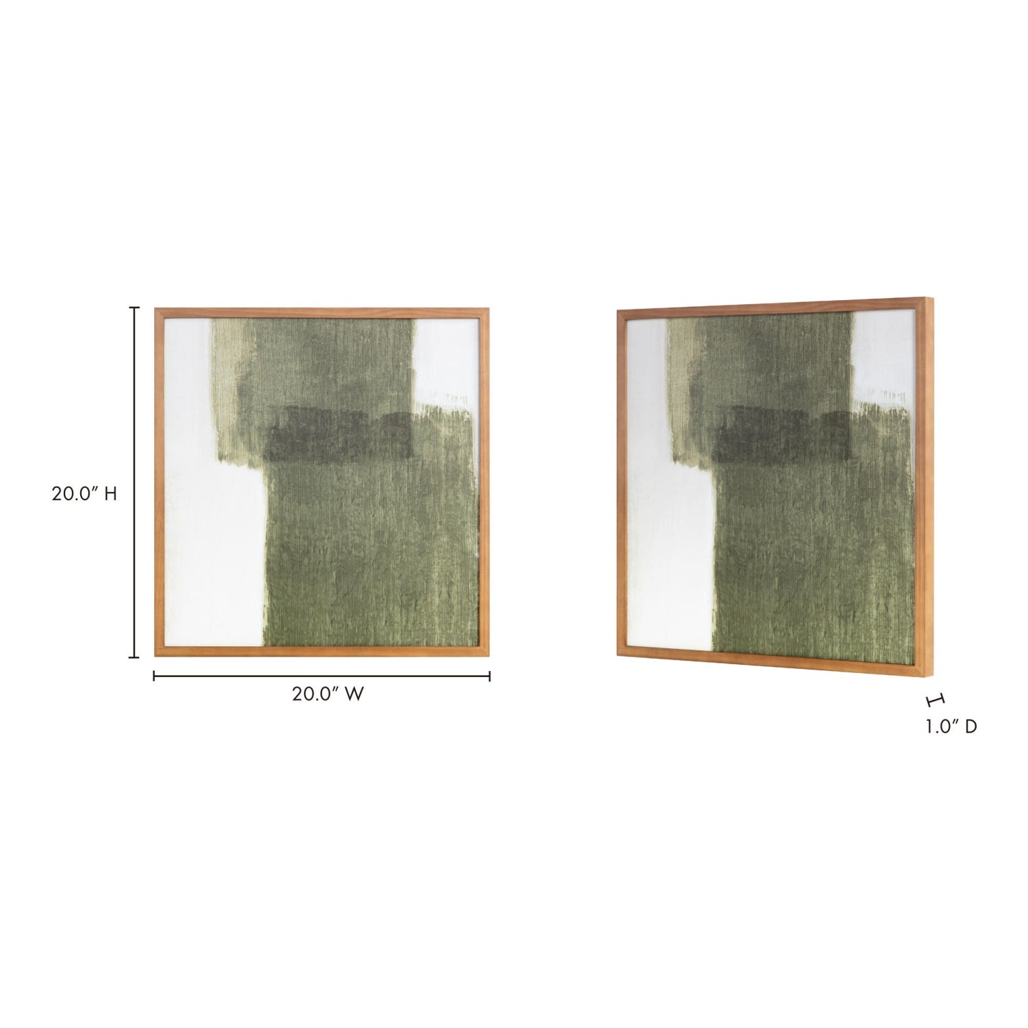 Brush is a bold and painterly piece where a grounding earthy green subdues sizeable brush strokes, and a warm-tone pine wood frame adds heirloom appeal.