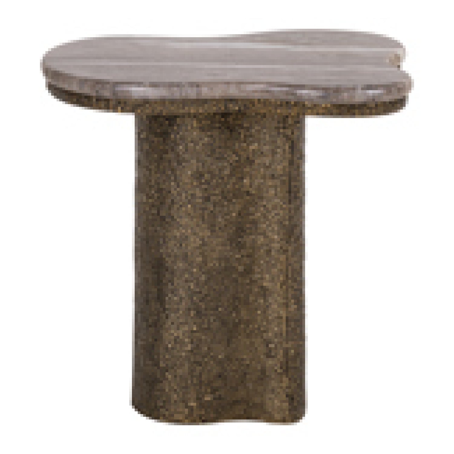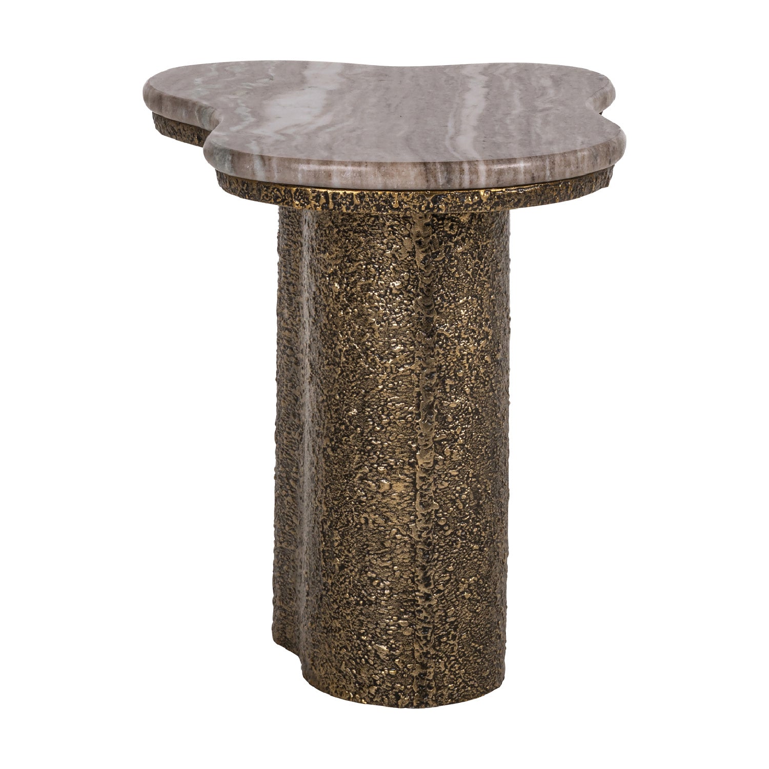 This end table features a compact shape with a closed and balanced silhouette. The brass-toned finish with a lightly aged impression creates a warm appearance. Its understated design suits placement next to seating. Elevate your living space with this striking organic-shaped marble end table from Richmond Interiors' Abandos collection. Featuring natural veining and a sculptural silhouette, this piece seamlessly blends artistic design with functional elegance. The smooth marble surface provides a refined display area for décor or beverages, while its distinctive form serves as a conversation-starting accent. Perfect for contemporary or eclectic interiors seeking a touch of understated luxury and timeless sophistication.