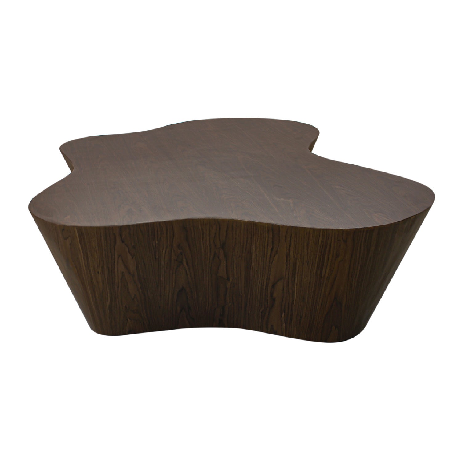 This coffee table has a low and solid silhouette with a clear horizontal emphasis. The top and base show a warm wood tone with visible texture creating a natural and calm appearance. Its balanced design makes it suitable for use in a seating area and supports a harmonious setting.