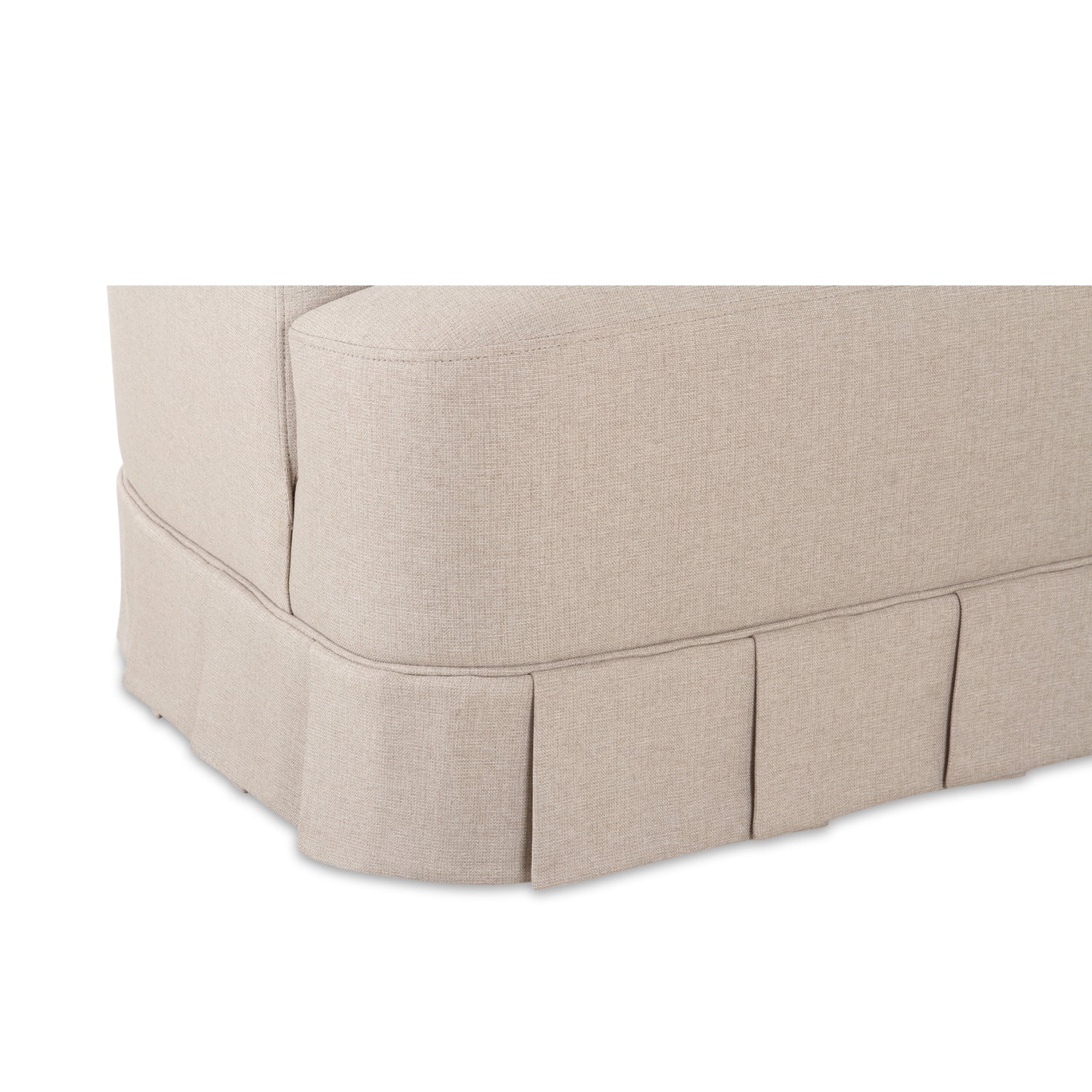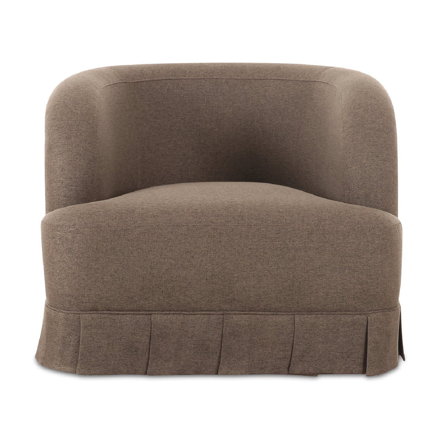 The Maren swivel chair exudes a soft, feminine aesthetic, upholstered in a warm, neutral fabric and featuring a playful yet refined box pleat base reminiscent of vintage finesse, straddling the line between contemporary form and traditional finish. With smoothly rounded corners and graceful, curving forms adding softness to the design, this piece is a study in elegance and subtlety.