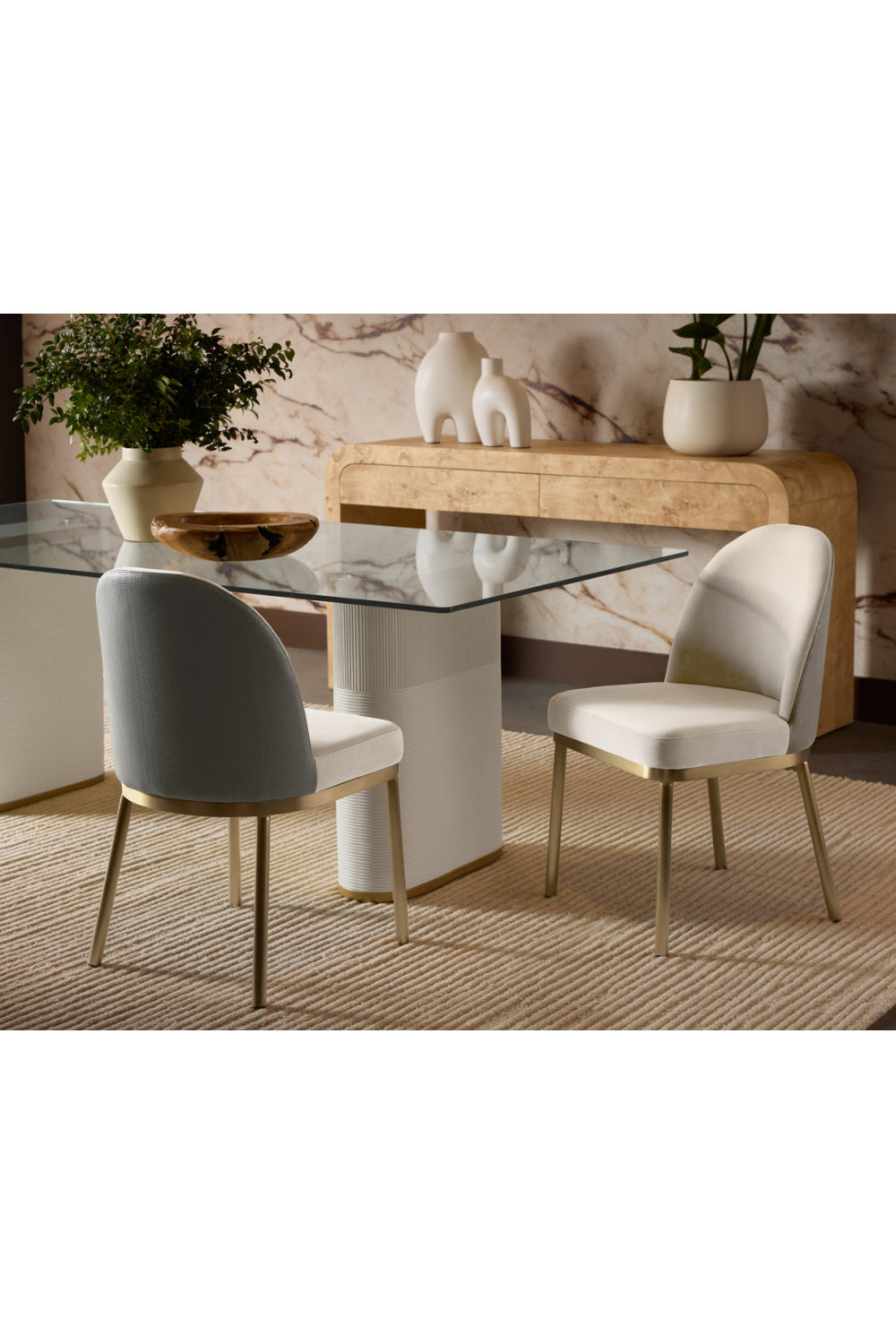 The minimalist frame of the Lavania Dining Chair is brought to life with an exquisite combination of two toned fabrics. Expertly upholstered with soft meg taupe fabric on the seat and interior while textured porcini taupe faux leather adds a tactile touch to the back exterior. The design is complemented with powder-coated antique brass stainless steel.