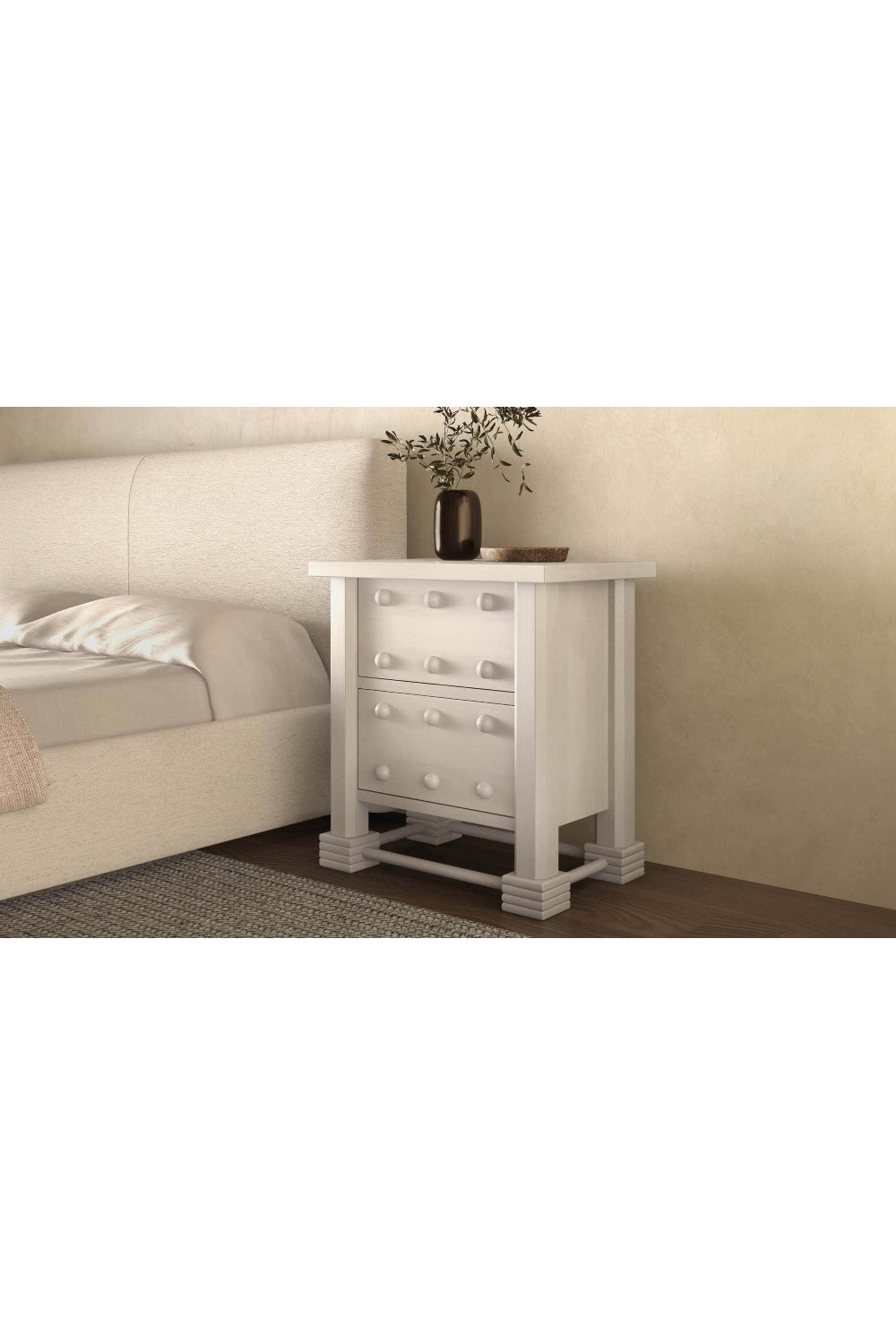 French-inspired elements and circular motifs enrich the Clement nightstand's oversized, chunky design. Crafted from mango wood with a whitewash finish, this ornate piece features carved detail feet with stretcher bars and drawer storage.