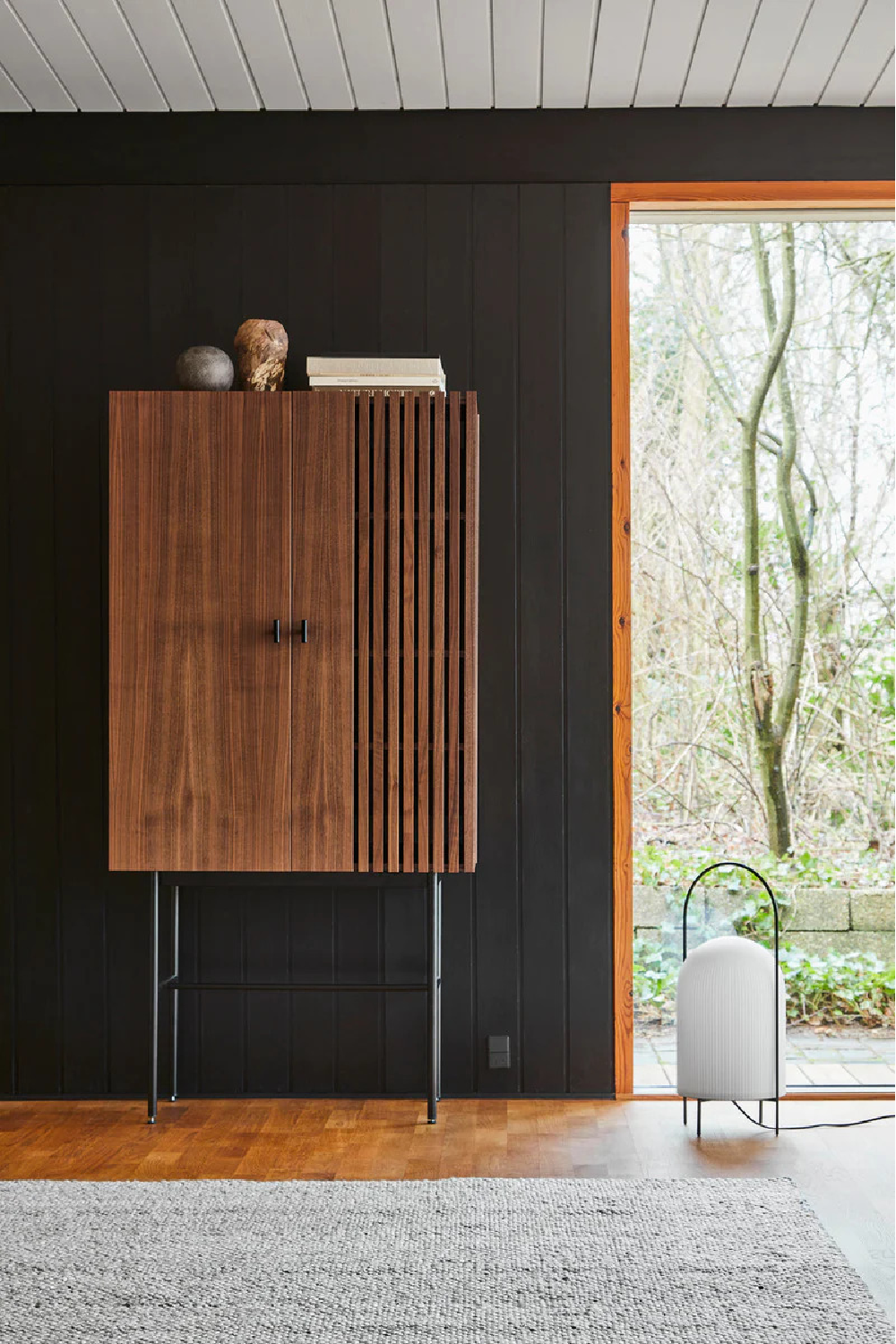 Ghost floor lamp is a modern interpretation of antique portable oil lamps. The slim metal rod surrounds the lampshade protectively while the overarching bail functions as a handle for carrying the lamp around. Made of translucent opal glass, the shade gives an illusion of a white cloth thrown over the light source. Resembling the appearance of a friendly ghost in the air. The subtle vertical groove pattern on the surface fades out gradually upwards, emphasizing the lamp’s refined sculptural character. The cord comes with a dimmable switch.