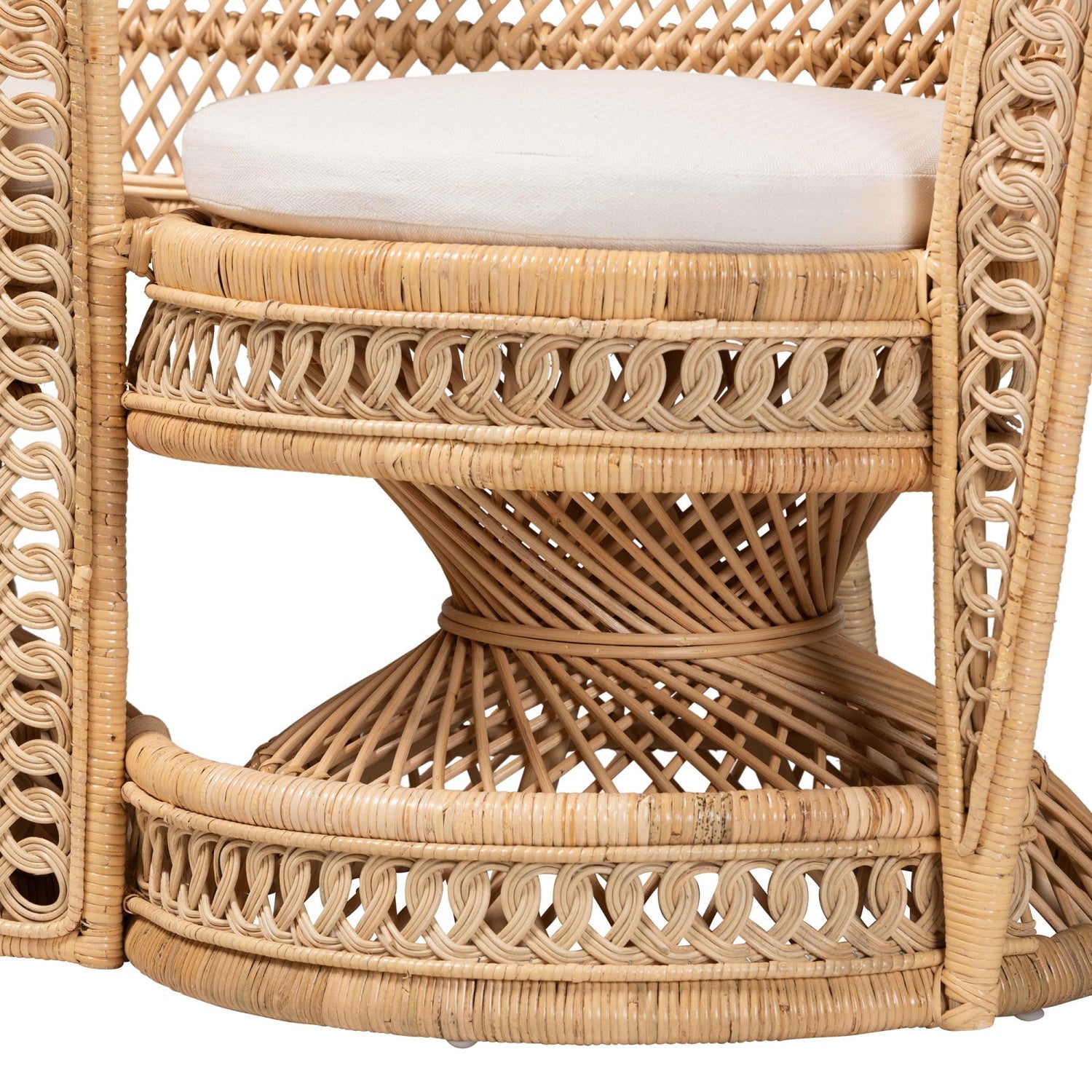 Cultivate an atmosphere of magnificent grandeur in your space with the stunning Nerita two-seater peacock accent chair. This bohemian piece is meticulously handcrafted from natural rattan by skilled artisans. The intertwining design of the backrests create a truly captivating display of diverse geometry while forming convenient armrests. The Nerita will arrive fully assembled and features plush fabric upholstered seat cushions for superb comfort. Boasting a poise of rustic refinement, the Nerita peacock accent chair is sure to leave an impression.