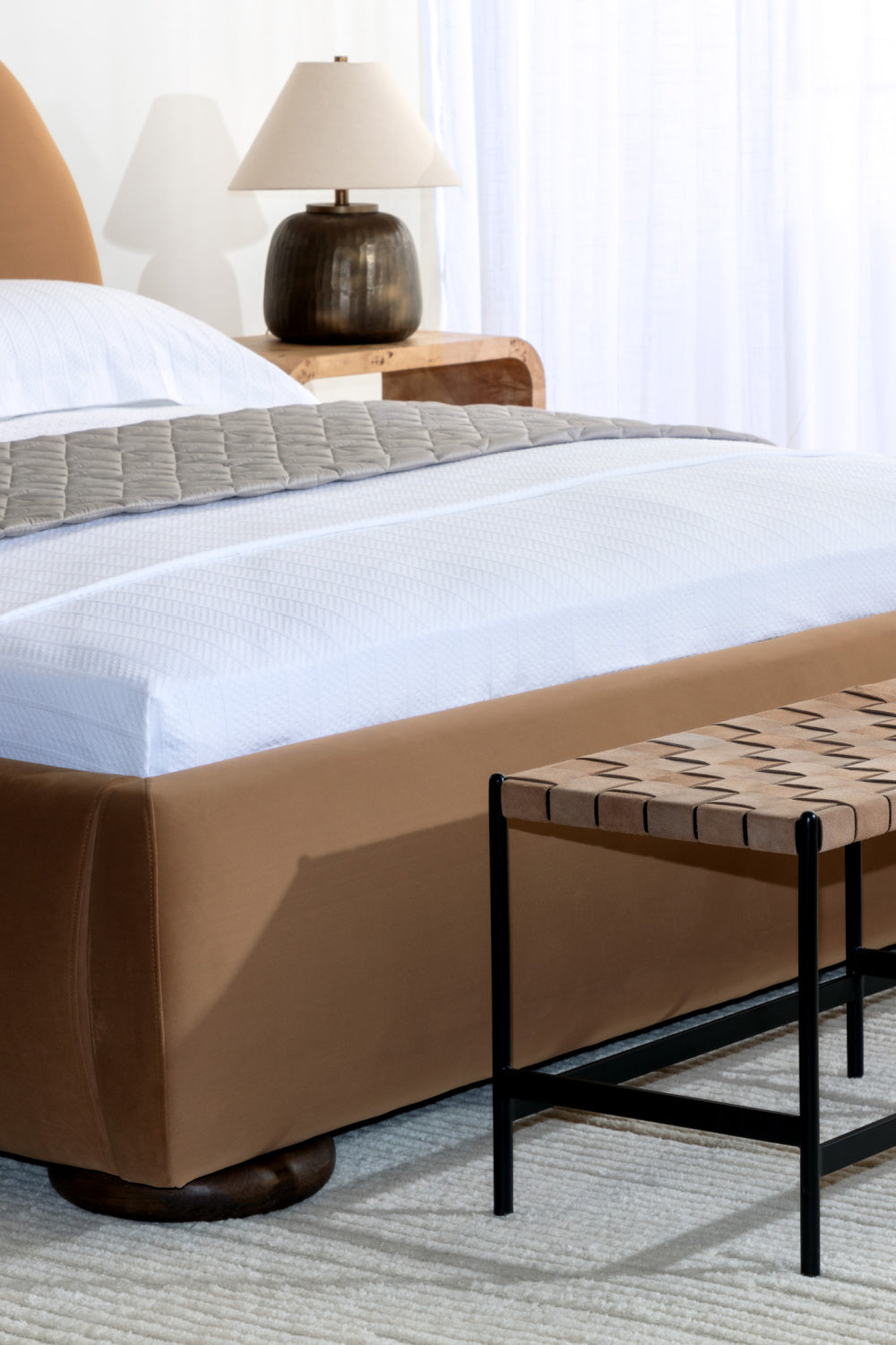 The Pradiva Table Lamp is quietly expressive. Its rounded metal base is hammered by hand, giving each curve a rhythmic, tactile quality that plays with light and shadow. The antique brass metal finish shifts subtly with the room — warm, burnished, and rich with depth. Topped with tapered linen shade, it brings a calming presence to side tables, consoles, or reading corners.