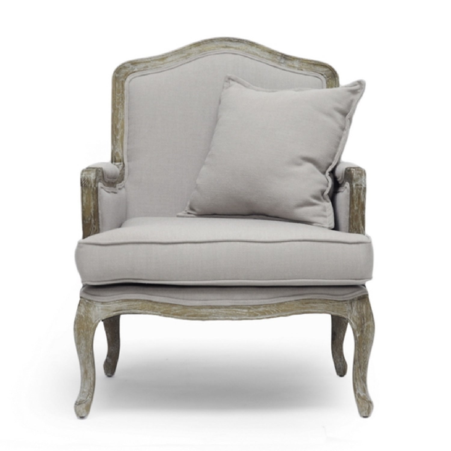 The Constanza French Living Room Chair will show you why French style has worked its way into the modern home. The distressed look of the antiqued finish exposed rubberwood frame is surprisingly versatile, fitting with like-minded traditional French furnishings as well as sleek modern and industrial styles. Similarly versatile is the neutral gray-beige linen upholstery, encasing comfy foam cushions. We recommend exclusively spot cleaning. The Constanza Designer Arm Chair is made in China and requires assembly.