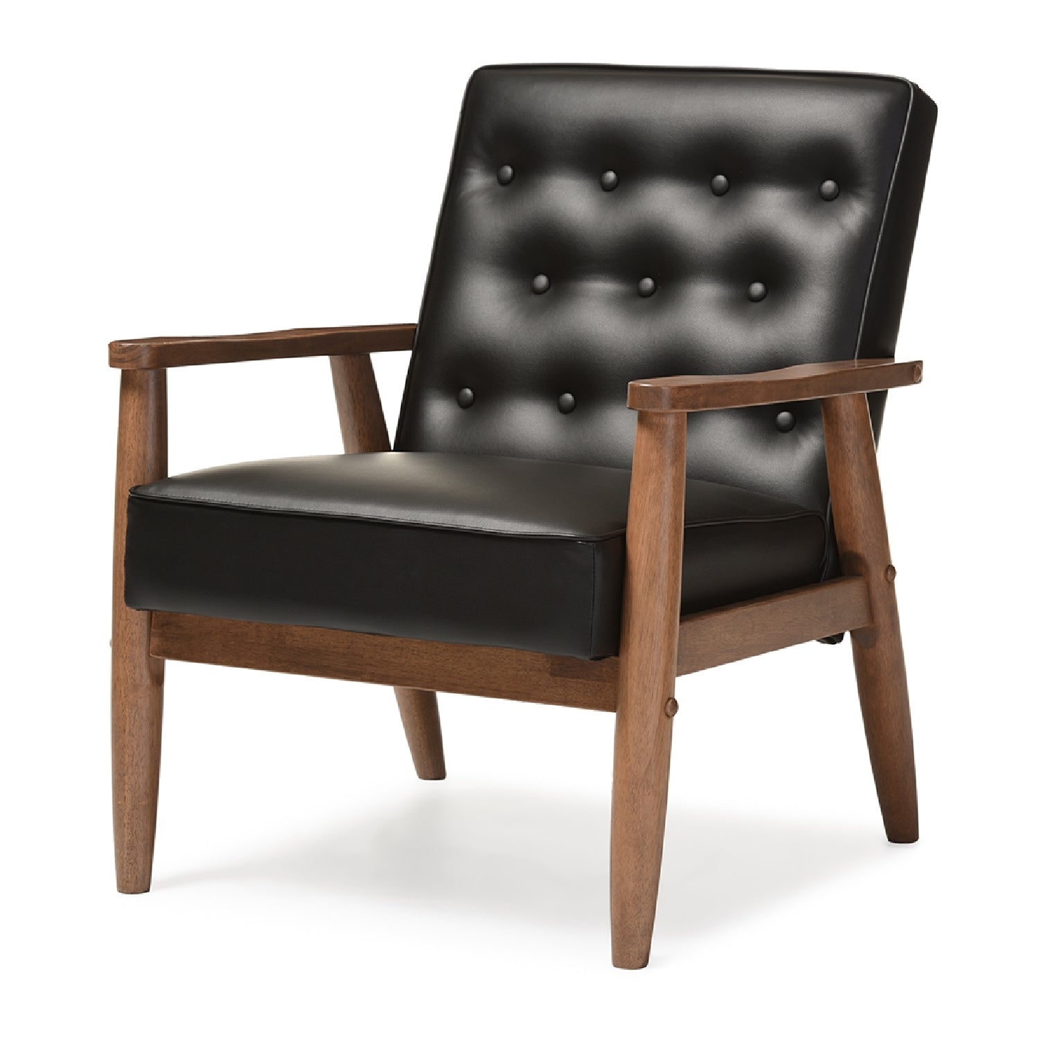A simple, post-modern design that works well with a variety of styles, the Sorrento lounge chair is upholstered in faux leather and fabric with solid rubberwood legs and frame. The sculptural arms and wide, welcoming seat are a throwback to classic 1950s and 60s Danish design. A fully upholstered seat with exposed dark walnut wood looks great from all angles, whether in a lounge arrangement, public waiting area or private office. The splayed legs and button-tufting design add a retro modern touch to this piece of clean lines furniture. The Sorrento also features light weight and easy handling. It will be suitable for those urban dwellers with limited space. It could be a cool-looking reading nook within 30 minutes of assembly out of a box.