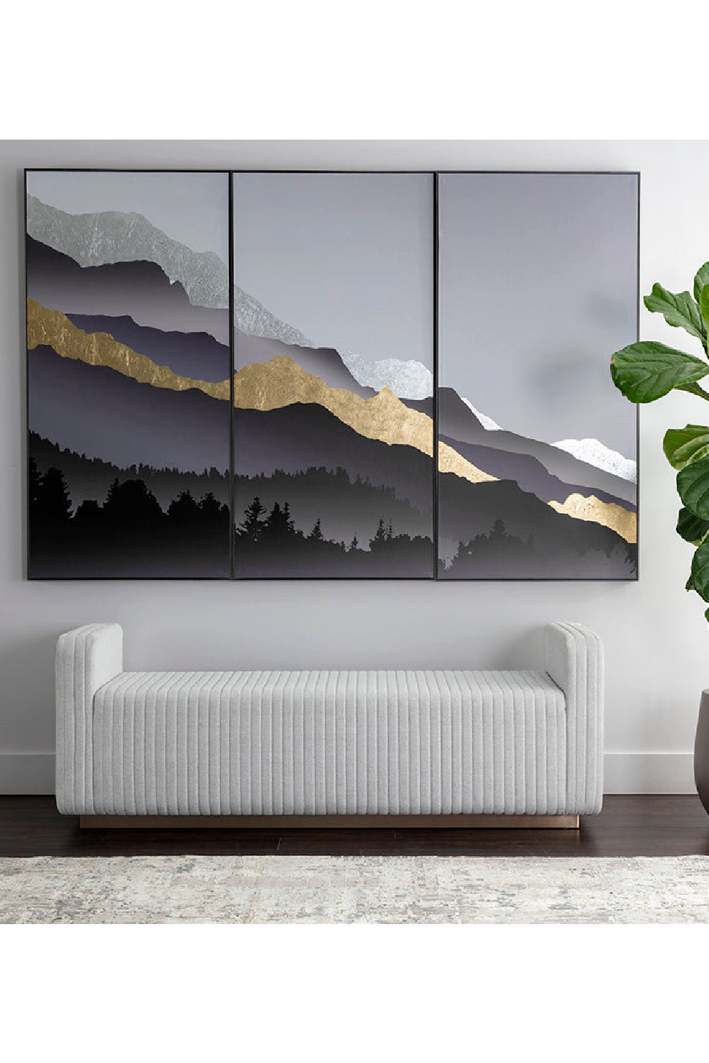 Boasting a chic block design, this modern bench features a minimalist design with high impact. Upholstered in Ernst Silverstone fabric and Maven black faux leather with channel tufting. Completed with a striking antique brass stainless steel base.
