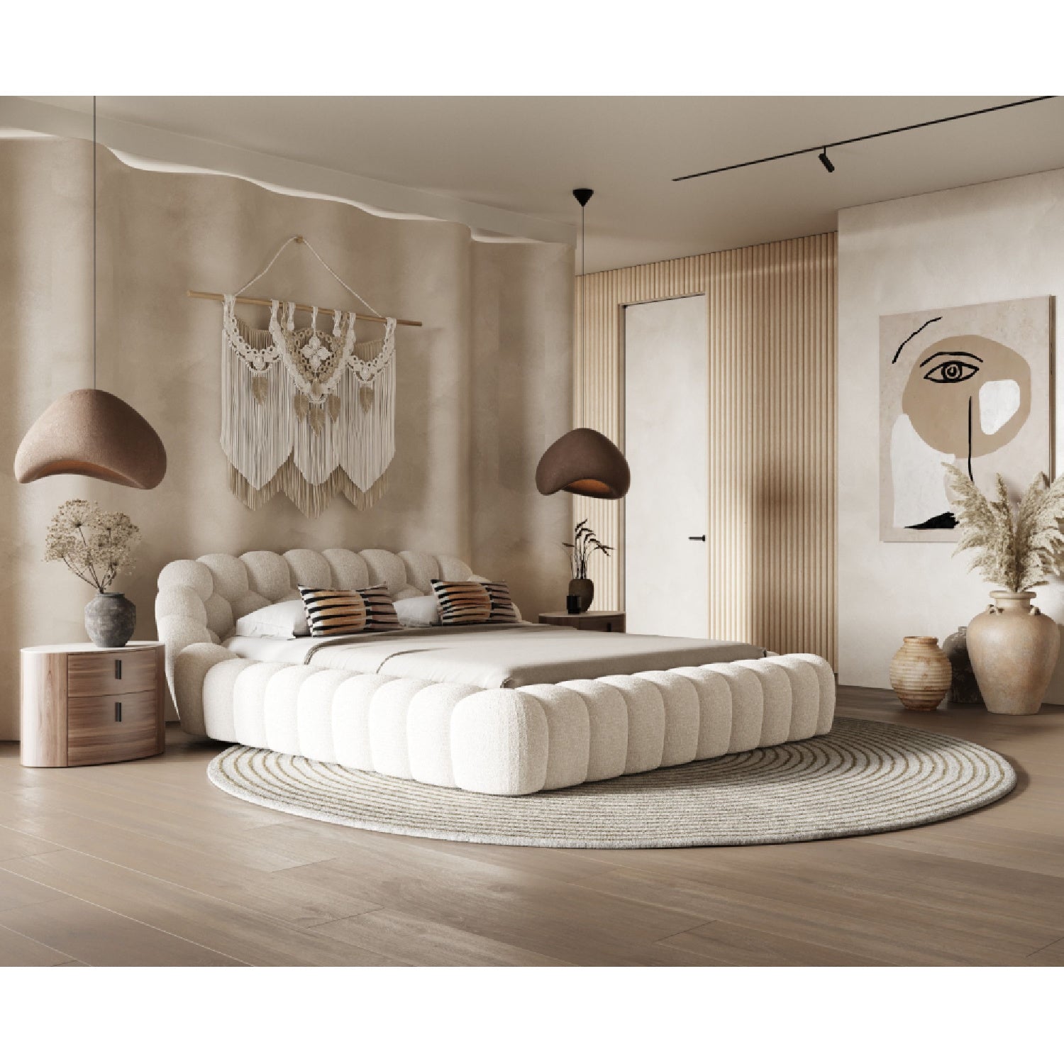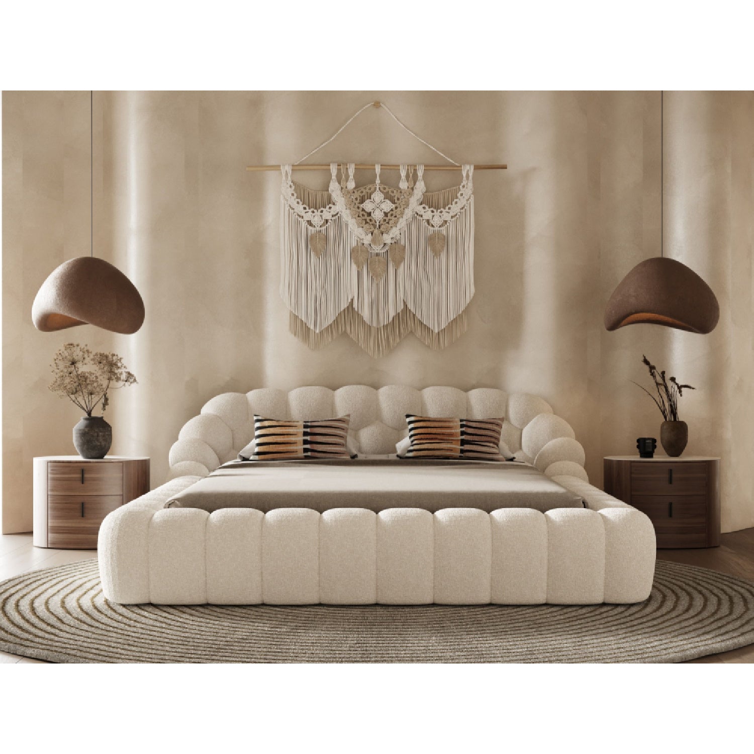 The Hexagonal Tufted King Bed brings architectural elegance to your bedroom with its distinctive geometric headboard design. Featuring deep button tufting that adds dimension and visual interest, this statement piece combines modern sophistication with refined comfort. The king-size frame provides ample sleeping space, while the structured silhouette anchors your room with contemporary style. Perfect for those seeking a bed that transcends ordinary bedroom furniture and becomes a true focal point of interior design.