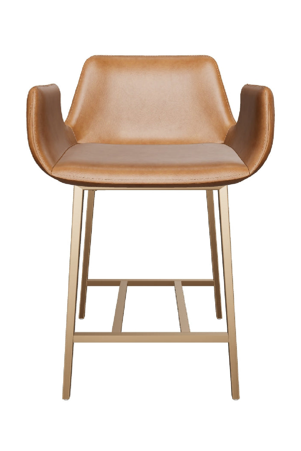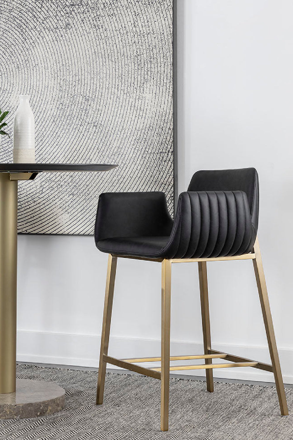 With its stunning scooped design, the Lucano Counter Stool is an impressive addition to any dining space. Features vertical channel tufting on exterior seat. Stocked in smooth milliken faux leather and completed with gold stainless steel legs.