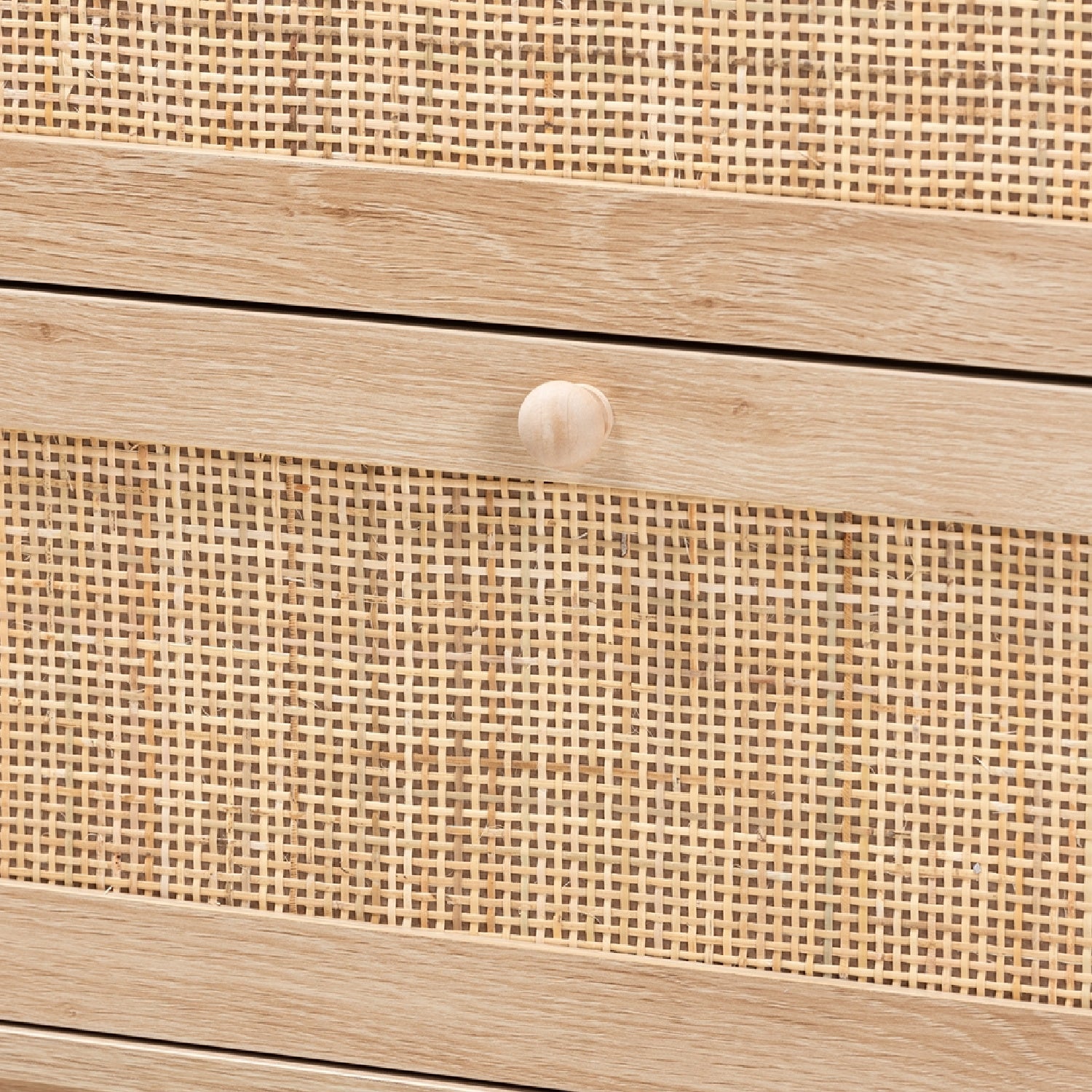 Exemplary of classic design, the Elsbeth storage cabinet offers fantastic efficiency in robust style. This Japandi inspired piece is comprised of a sturdy wood frame embellished with woven rattan drawer fronts. Three wide drawers offer ample space to organize household essentials while the broad tabletop serves as a superb exhibit for decorations. The Elsbeth requires assembly and features tapered legs for excellent stability and support while maintaining a sleek silhouette. Round drawer knobs lend unique visual geometry, making the Elsbeth storage cabinet an alluring addition to any interior layout.