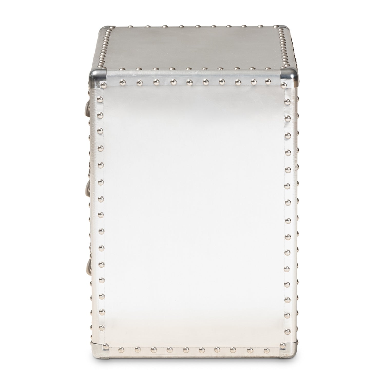 Bring chic industrial style into your space with the Armel end table. Constructed from wood and metal, this silver end table features cool rivet detailing along its edges. Three drawers provide space to keep household essentials organized. Polished silver metal drawer handles add a sleek touch. Inspired by vintage storage trunks, the Armel is fitted with corner protectors. Use this piece as an accent in the living room or other shared space. The Armel end table is made in China and will arrive fully assembled.