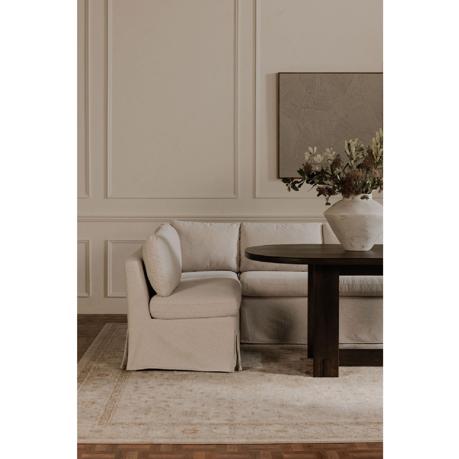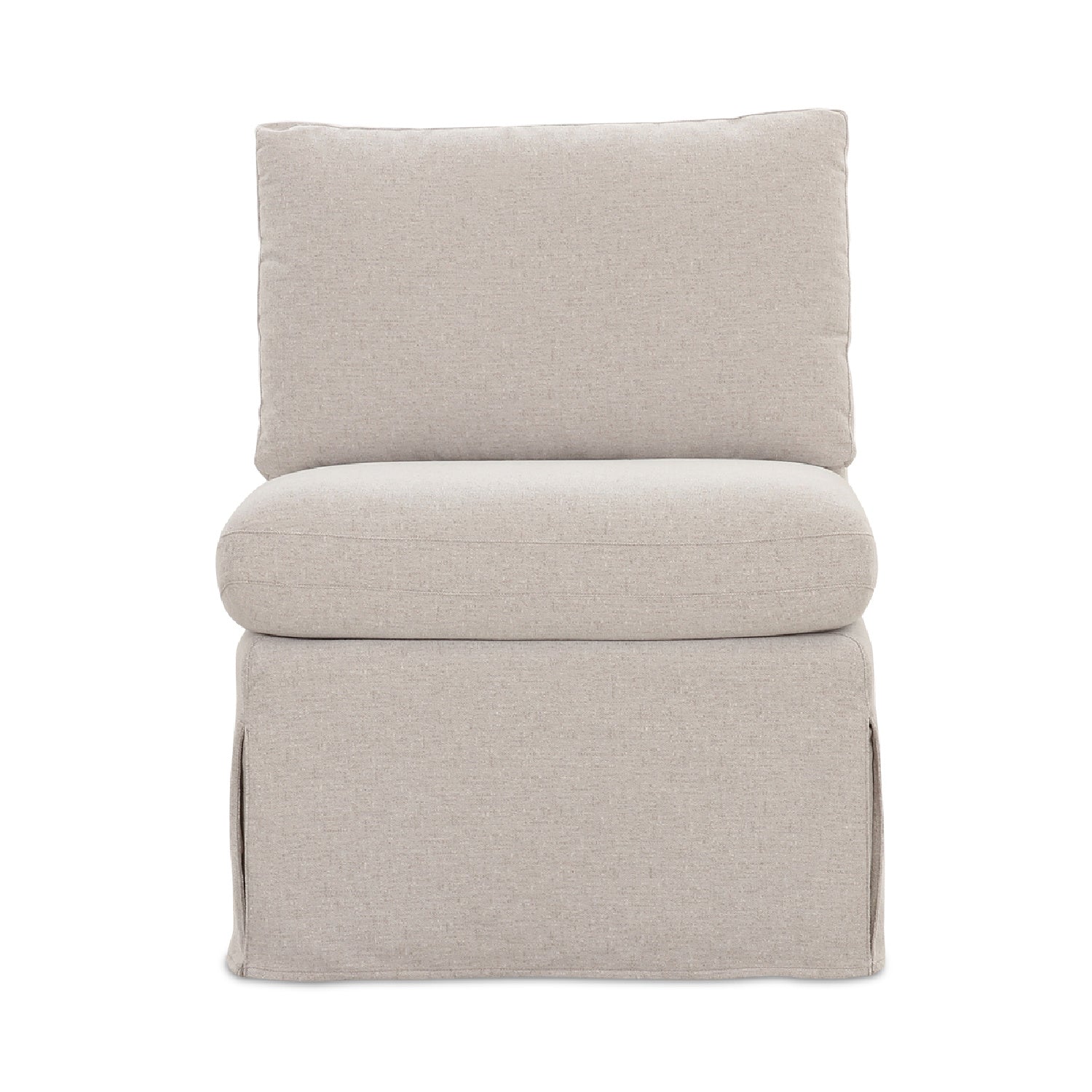 The Fable slipcover dining slipper chair's snug-fitting, washable slipcover with inverted pleats offers a tidy appearance and effortless upkeep. A slight tilt encourages a relaxed seating posture with a pillow back and seat cushions for comfort. Designed to be modular, it includes alligator clips to connect with other pieces in the collection, adapting seamlessly to various dining table sizes.