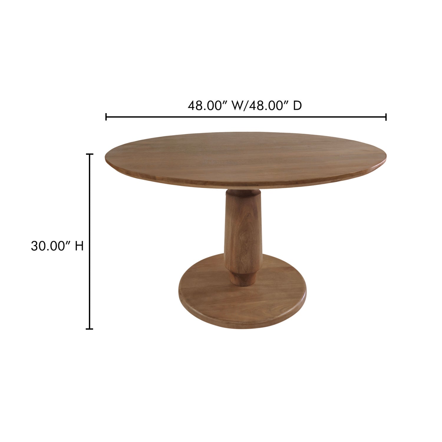 The Clark dining table marries a unifying round design with a refined beveled edge for seamless sophistication. Resting on a sturdy pedestal base with two captivating wooden indents at each of the two ends, the tapered form introduces depth and character to the dining space with impeccable craftsmanship and understated charm.