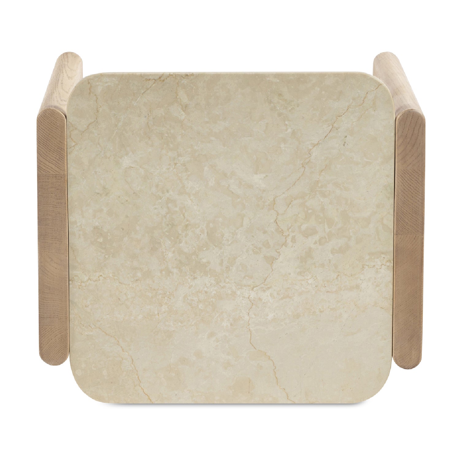 The Lane side table captures the essence of Scandinavian modern design. Its sleek, solid oak frame is accented by thick, curved elements that soften its silhouette, allowing its inset Italian Botticino marble top to take centerstage as its rounded overhang gracefully complements its solid oak legs.